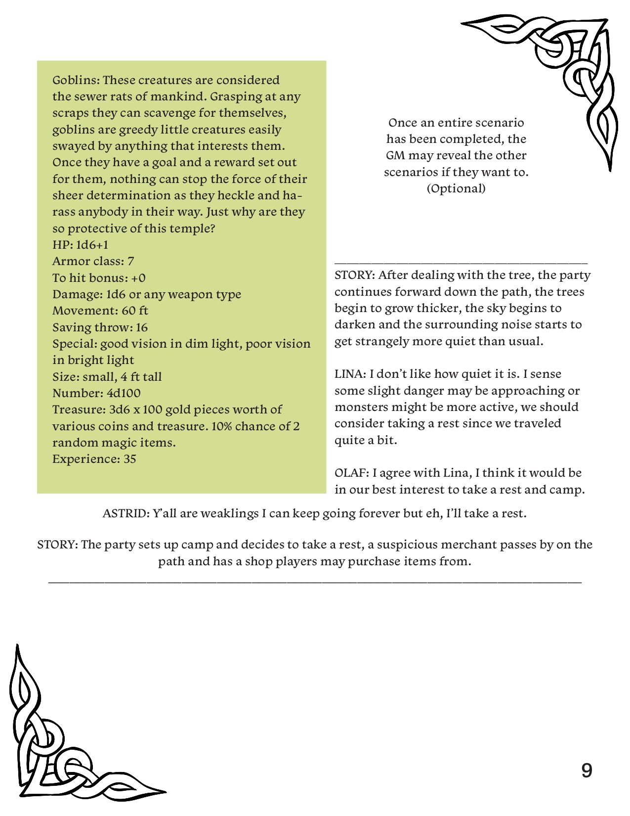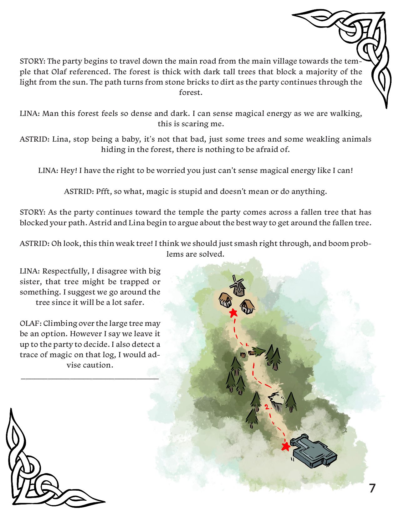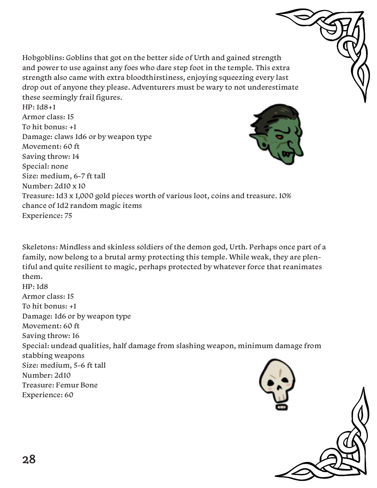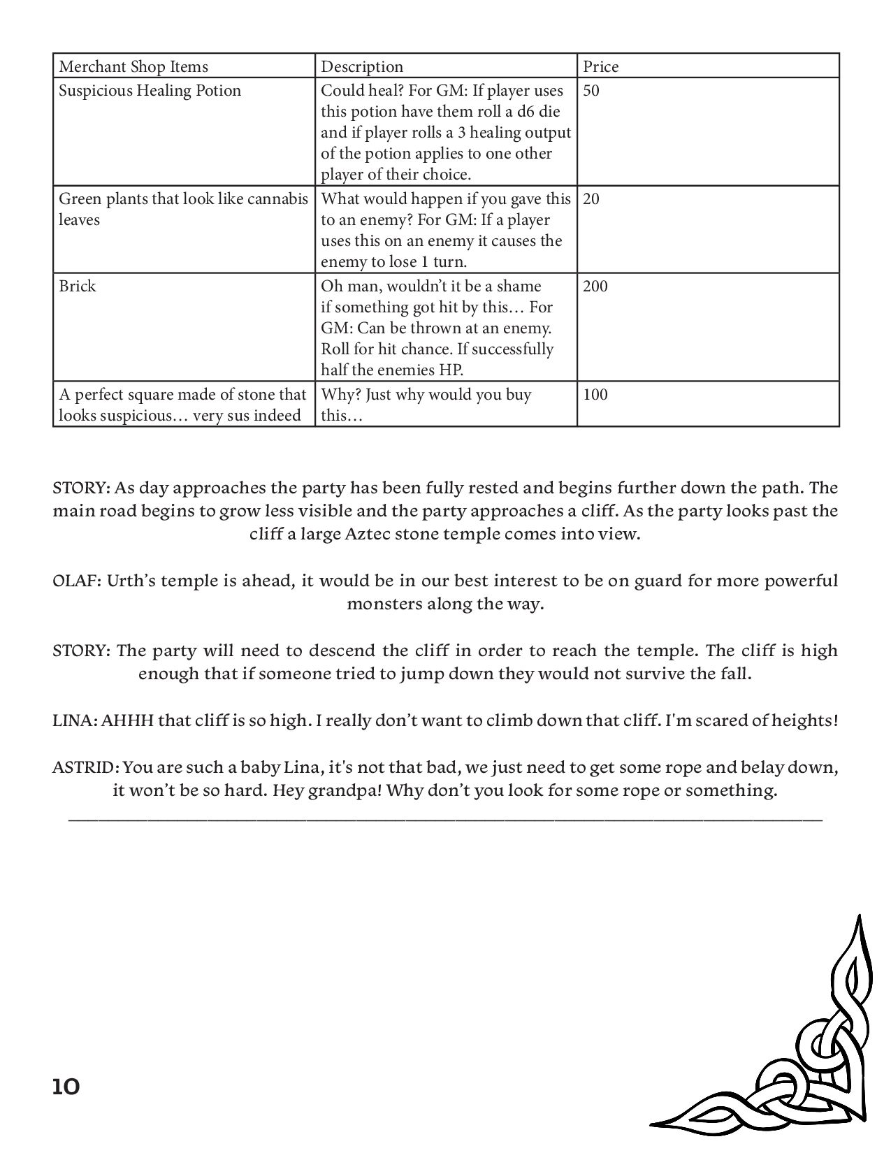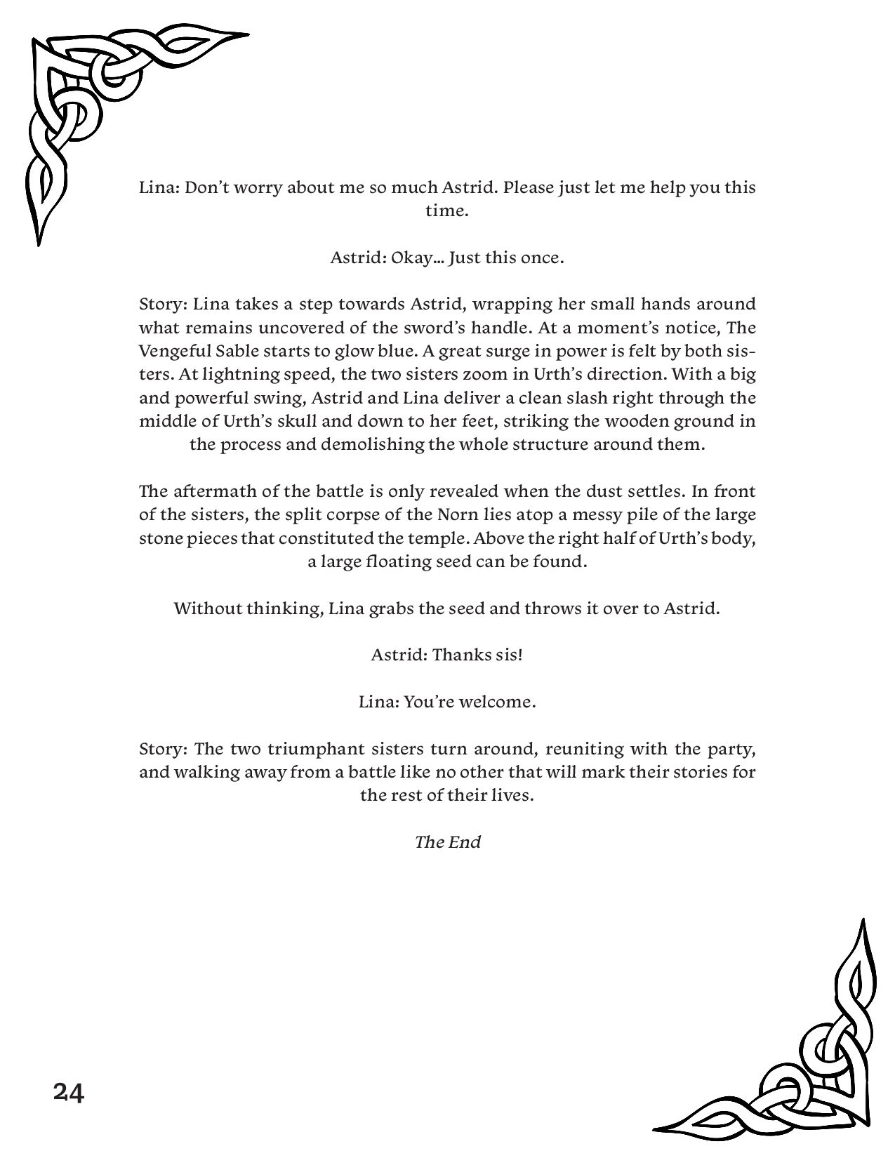 rolling and ruleset. When Urth’s HP reaches 10, the goddess drops the sword blade on the ground, Urth: The final encounter in the depths of the temple, an all powerful god- dess who has been wreaking havoc upon this land as long as anyone can remember. A devilish beast, a commanding personality that will attempt to worm his way into any mind that lets its guard down, allowing her to form the army he has to protect his domain. Deep down inside amongst her massive power, Urth is insecure and quite petty. She is capable of recognizing once she is bested, but if he is not shown the respect she believes she deserves, she will not hesitate to use her last ounces of power to ensure the ruining of the lives that dared cross her. HP: 30 Armor class: 16 To hit bonus: +5 Damage: 1d12 Movement: 60 ft Saving throw: 12 Special: Time Reversion, Reanimation Size: large, 8 ft Treasure: Seed to the Tree of Life (Yggdrasil) Experience: 1000 STORY: After a strong hit that throws off Urth’s grip, the sword blade is dropped to the ground. With no hesitation, the headstrong Lina jumps in to grab the fallen blade. However, as it is too heavy for her alone to handle, she is unable to move, standing right by an enraged Urth’s feet. The Norn takes a powerful swing towards the younger sister. Right on time, Astrid tack- les her sister at full speed, taking them both far enough away from danger. The sisters quickly get back on their feet, running to join the other party members. ASTRID: Let’s see if this works. STORY: Astrid grabs the hilt of The Vengeful Sabel and connects it to the loose blade that Lina has placed on the ground. Almost immediately, like a magnet, the two pieces stuck together, balancing the weight of the overly heavy sword. The Vengeful Sabel was such a mighty sword, that even Astrid knew it was too much for her. ASTRID: It’s okay Lina, you can leave it to me. STORY: Astrid drags the sword on the ground, clearly struggling to wield the weapon appro- priately. The movement of the sword, however, becomes quicker and quicker, speeding up in the direction of Urth. Suddenly, Astrid is now being dragged by the sword. Turns out Urth is rewinding the blade’s position back to where it was before the older sister tackled it away. All the party members are forced to quickly gather behind the helpless Astrid, mustering all their strength to help Lina keep her older sister from being pulled into Urth’s range. 22