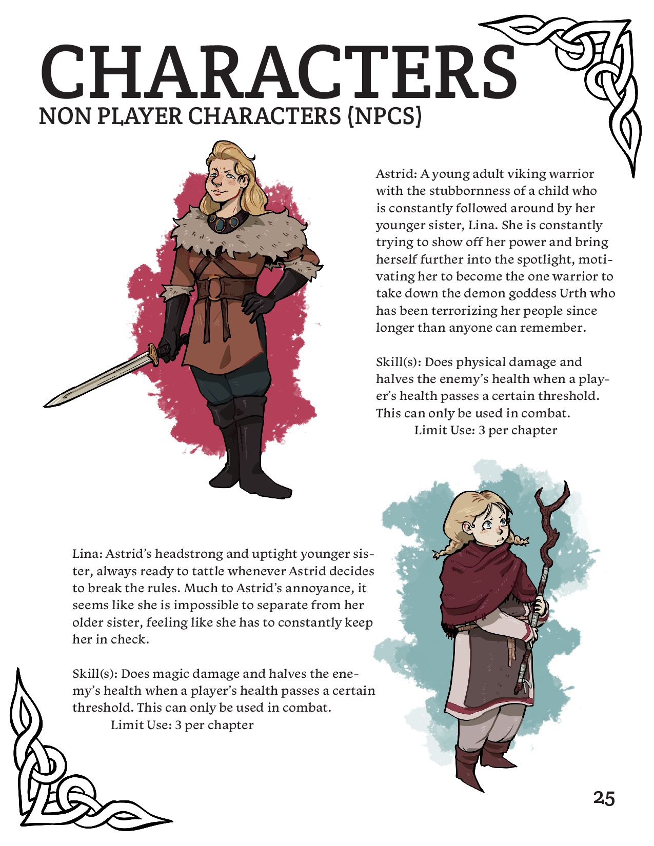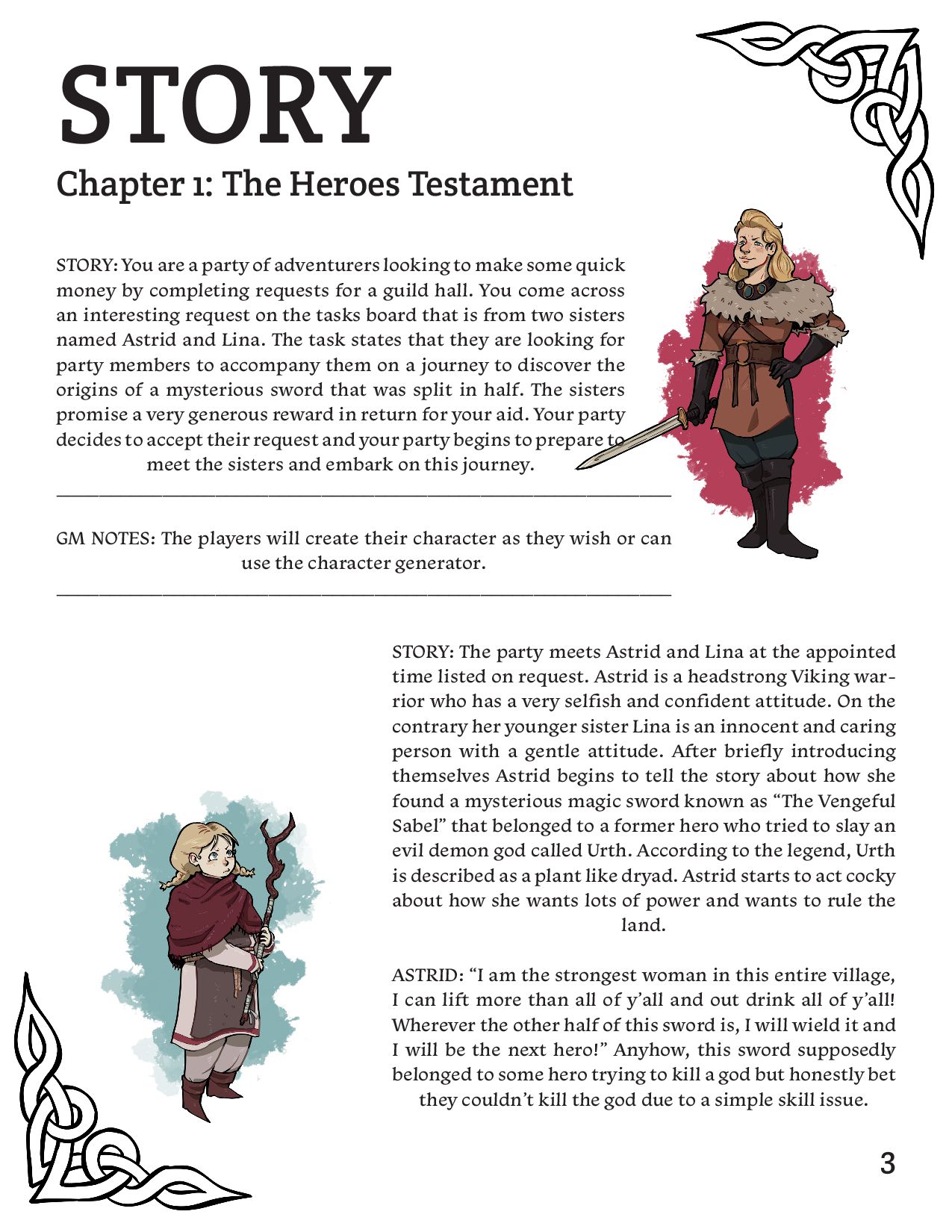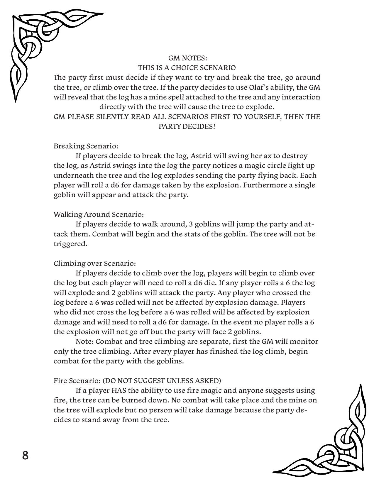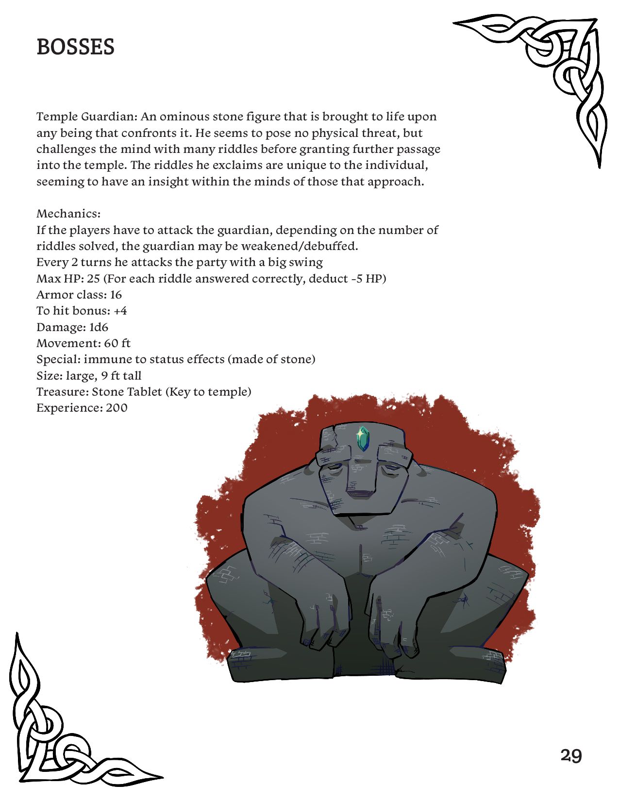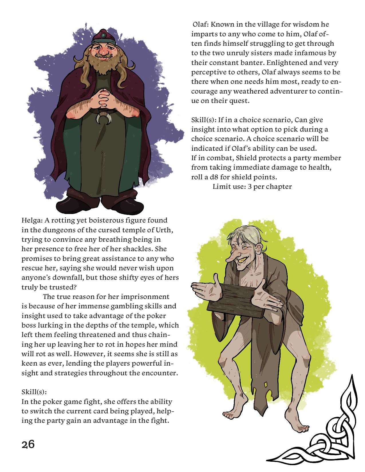 rolling and ruleset. When Urth’s HP reaches 10, the goddess drops the sword blade on the ground, Urth: The final encounter in the depths of the temple, an all powerful god- dess who has been wreaking havoc upon this land as long as anyone can remember. A devilish beast, a commanding personality that will attempt to worm his way into any mind that lets its guard down, allowing her to form the army he has to protect his domain. Deep down inside amongst her massive power, Urth is insecure and quite petty. She is capable of recognizing once she is bested, but if he is not shown the respect she believes she deserves, she will not hesitate to use her last ounces of power to ensure the ruining of the lives that dared cross her. HP: 30 Armor class: 16 To hit bonus: +5 Damage: 1d12 Movement: 60 ft Saving throw: 12 Special: Time Reversion, Reanimation Size: large, 8 ft Treasure: Seed to the Tree of Life (Yggdrasil) Experience: 1000 STORY: After a strong hit that throws off Urth’s grip, the sword blade is dropped to the ground. With no hesitation, the headstrong Lina jumps in to grab the fallen blade. However, as it is too heavy for her alone to handle, she is unable to move, standing right by an enraged Urth’s feet. The Norn takes a powerful swing towards the younger sister. Right on time, Astrid tack- les her sister at full speed, taking them both far enough away from danger. The sisters quickly get back on their feet, running to join the other party members. ASTRID: Let’s see if this works. STORY: Astrid grabs the hilt of The Vengeful Sabel and connects it to the loose blade that Lina has placed on the ground. Almost immediately, like a magnet, the two pieces stuck together, balancing the weight of the overly heavy sword. The Vengeful Sabel was such a mighty sword, that even Astrid knew it was too much for her. ASTRID: It’s okay Lina, you can leave it to me. STORY: Astrid drags the sword on the ground, clearly struggling to wield the weapon appro- priately. The movement of the sword, however, becomes quicker and quicker, speeding up in the direction of Urth. Suddenly, Astrid is now being dragged by the sword. Turns out Urth is rewinding the blade’s position back to where it was before the older sister tackled it away. All the party members are forced to quickly gather behind the helpless Astrid, mustering all their strength to help Lina keep her older sister from being pulled into Urth’s range. 22