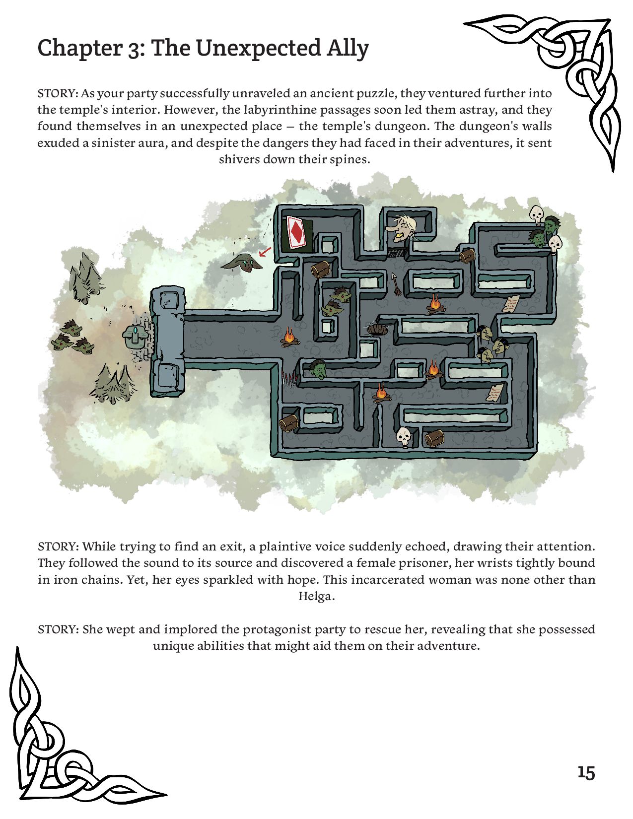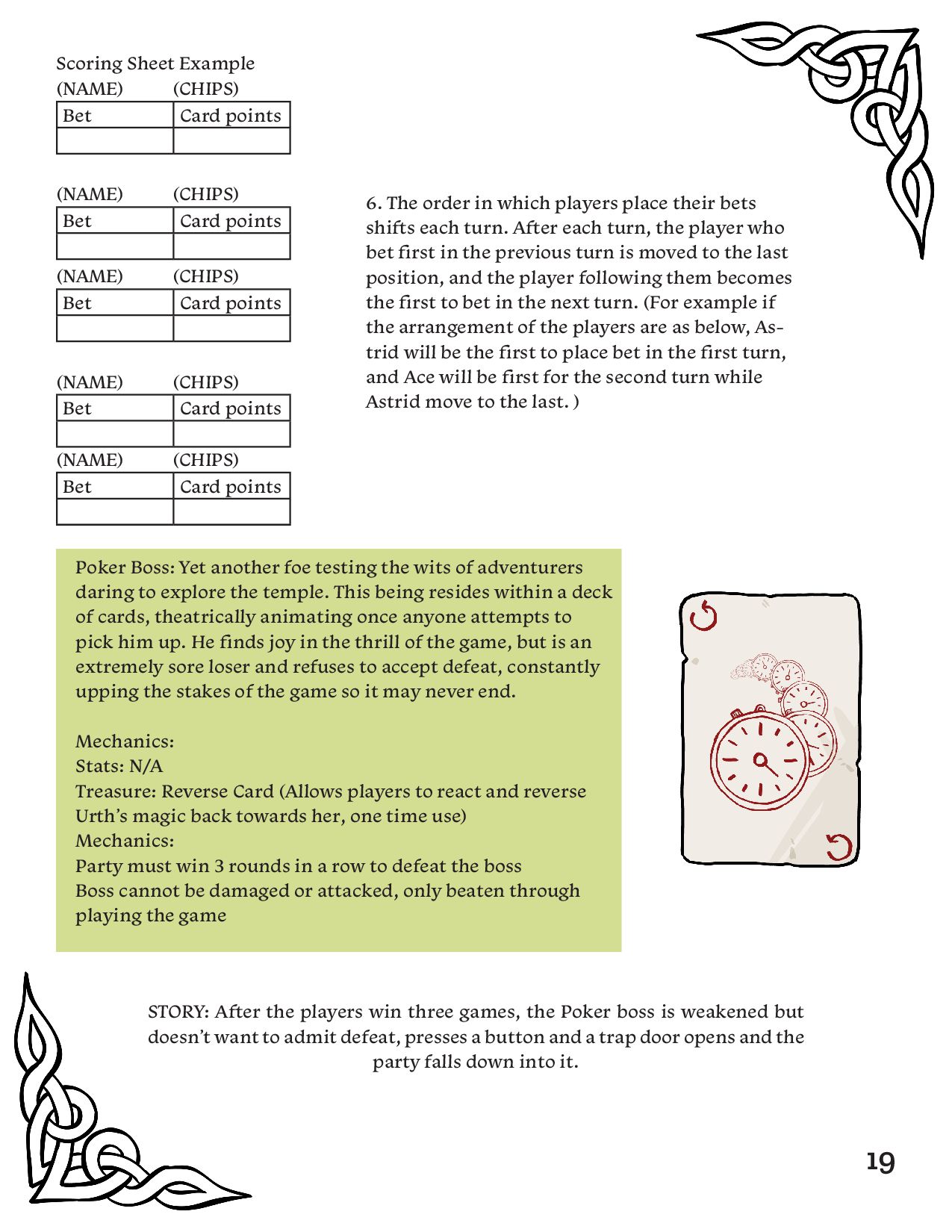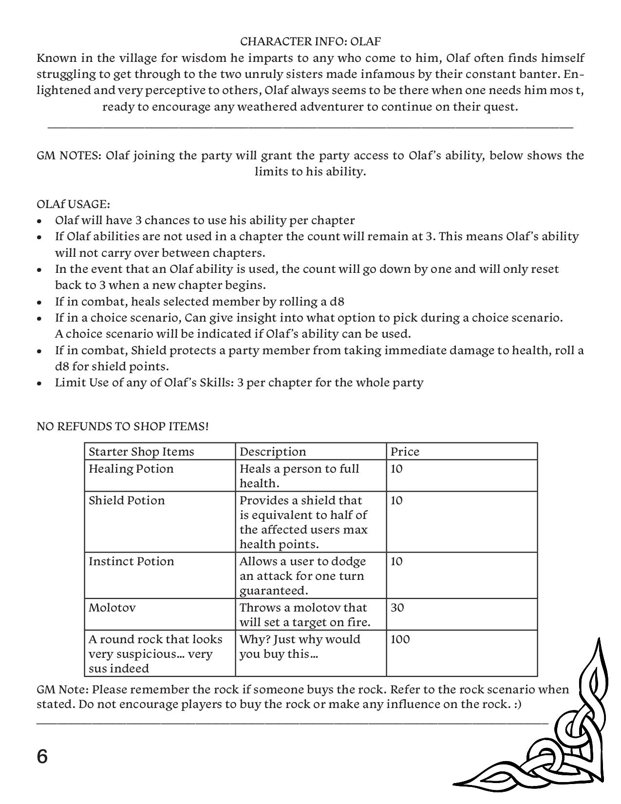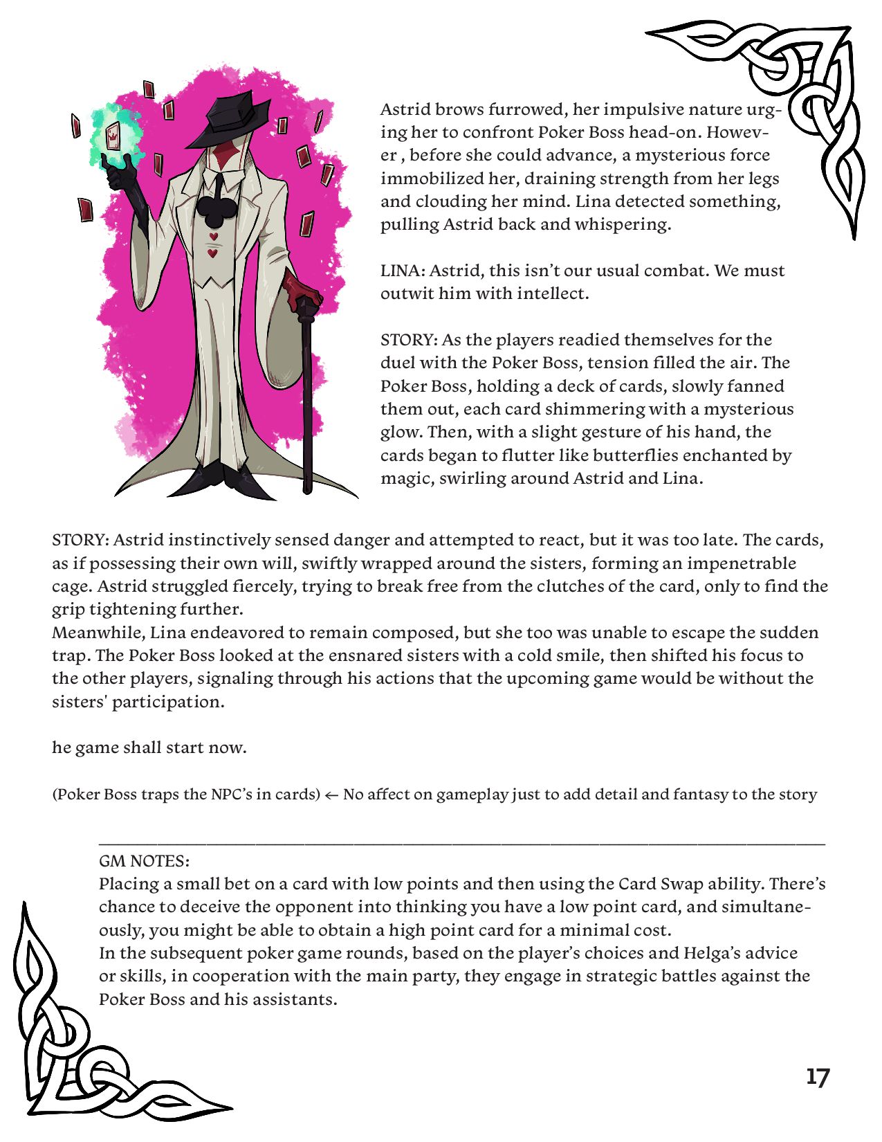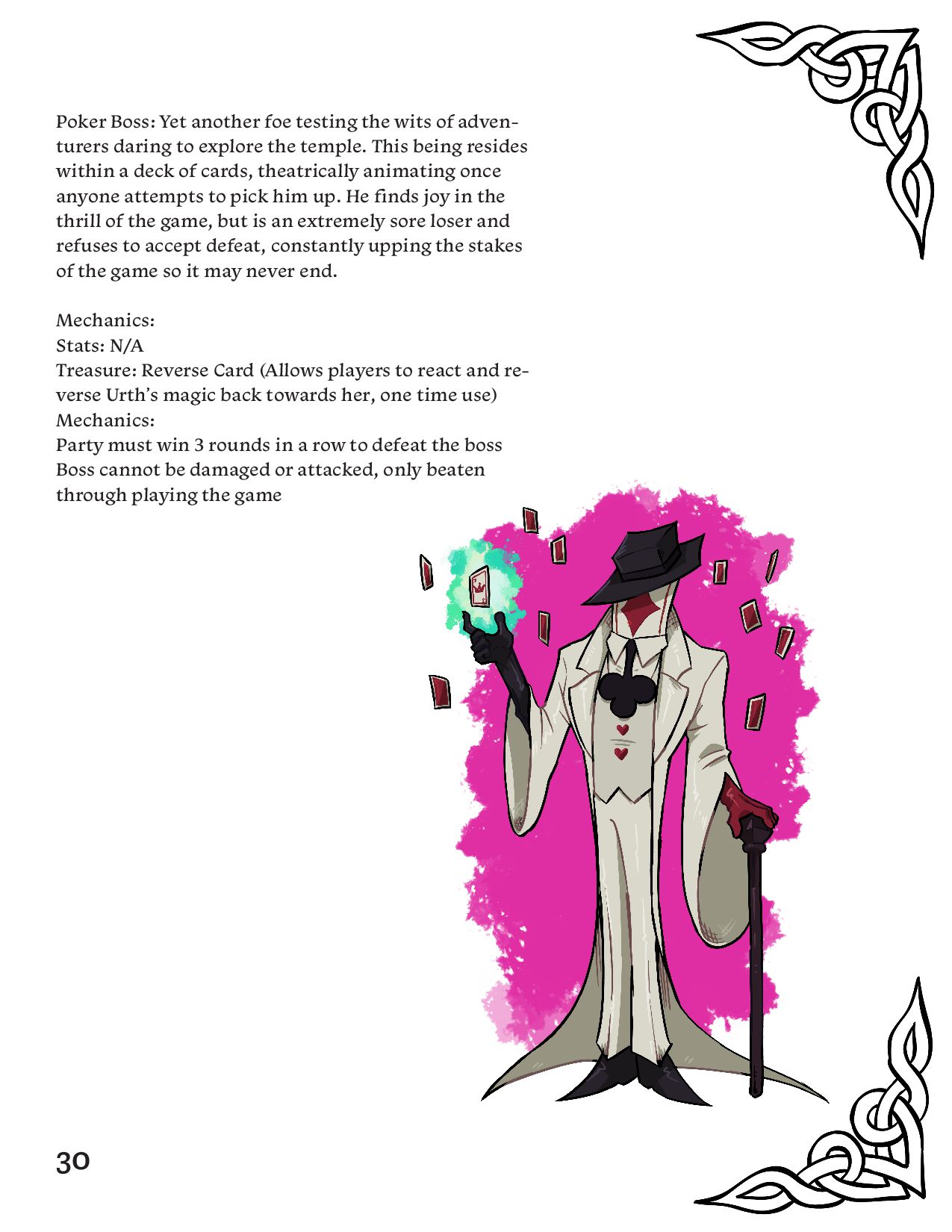 rolling and ruleset. When Urth’s HP reaches 10, the goddess drops the sword blade on the ground, Urth: The final encounter in the depths of the temple, an all powerful god- dess who has been wreaking havoc upon this land as long as anyone can remember. A devilish beast, a commanding personality that will attempt to worm his way into any mind that lets its guard down, allowing her to form the army he has to protect his domain. Deep down inside amongst her massive power, Urth is insecure and quite petty. She is capable of recognizing once she is bested, but if he is not shown the respect she believes she deserves, she will not hesitate to use her last ounces of power to ensure the ruining of the lives that dared cross her. HP: 30 Armor class: 16 To hit bonus: +5 Damage: 1d12 Movement: 60 ft Saving throw: 12 Special: Time Reversion, Reanimation Size: large, 8 ft Treasure: Seed to the Tree of Life (Yggdrasil) Experience: 1000 STORY: After a strong hit that throws off Urth’s grip, the sword blade is dropped to the ground. With no hesitation, the headstrong Lina jumps in to grab the fallen blade. However, as it is too heavy for her alone to handle, she is unable to move, standing right by an enraged Urth’s feet. The Norn takes a powerful swing towards the younger sister. Right on time, Astrid tack- les her sister at full speed, taking them both far enough away from danger. The sisters quickly get back on their feet, running to join the other party members. ASTRID: Let’s see if this works. STORY: Astrid grabs the hilt of The Vengeful Sabel and connects it to the loose blade that Lina has placed on the ground. Almost immediately, like a magnet, the two pieces stuck together, balancing the weight of the overly heavy sword. The Vengeful Sabel was such a mighty sword, that even Astrid knew it was too much for her. ASTRID: It’s okay Lina, you can leave it to me. STORY: Astrid drags the sword on the ground, clearly struggling to wield the weapon appro- priately. The movement of the sword, however, becomes quicker and quicker, speeding up in the direction of Urth. Suddenly, Astrid is now being dragged by the sword. Turns out Urth is rewinding the blade’s position back to where it was before the older sister tackled it away. All the party members are forced to quickly gather behind the helpless Astrid, mustering all their strength to help Lina keep her older sister from being pulled into Urth’s range. 22