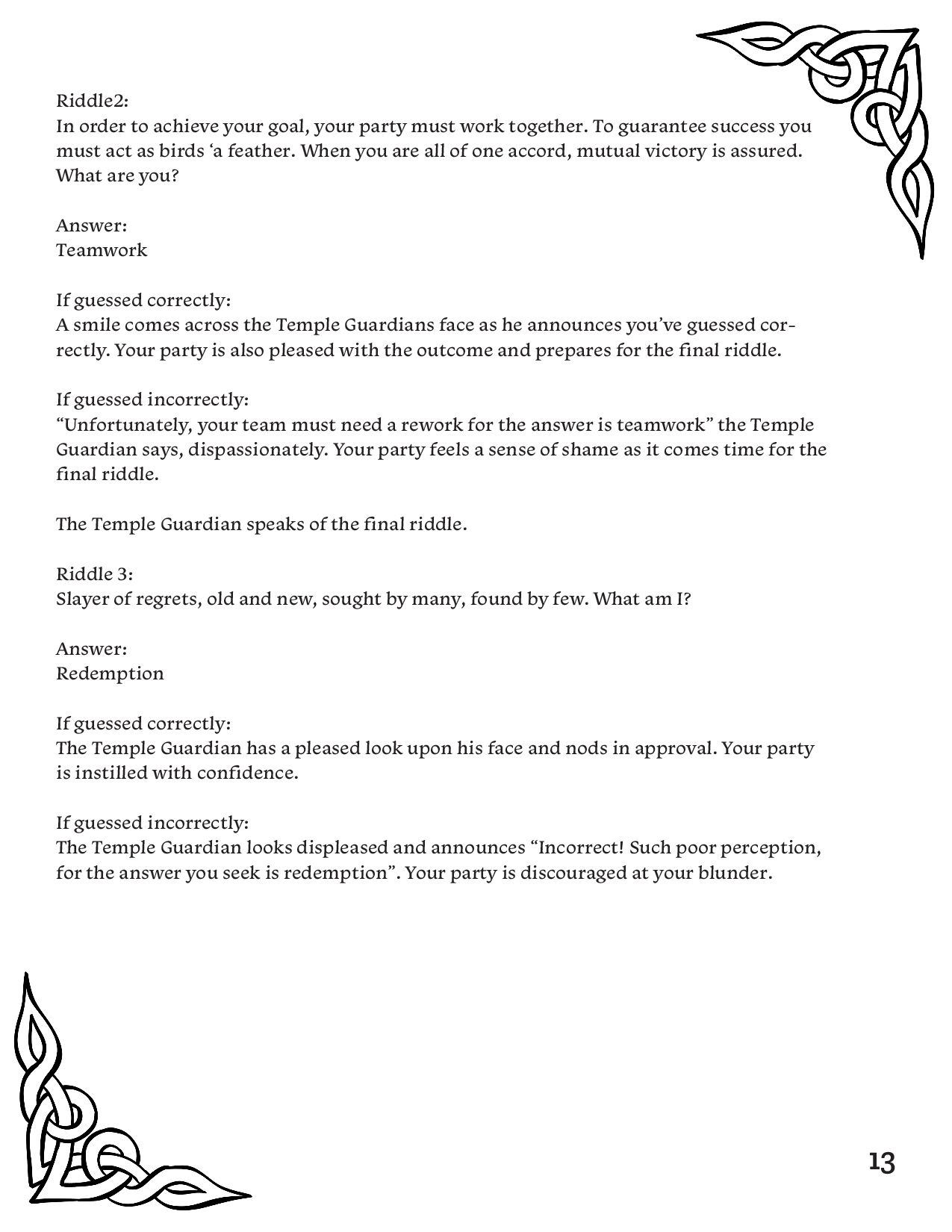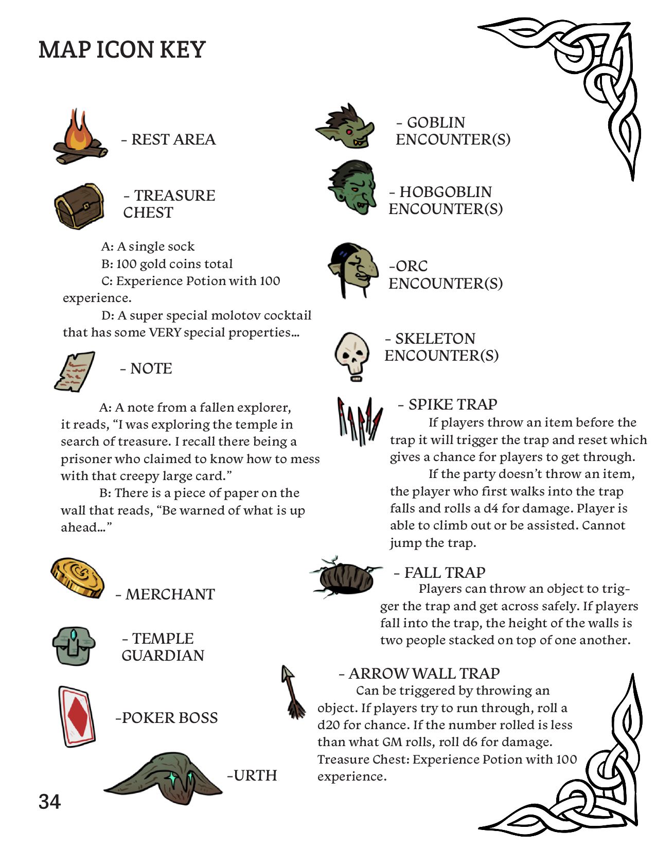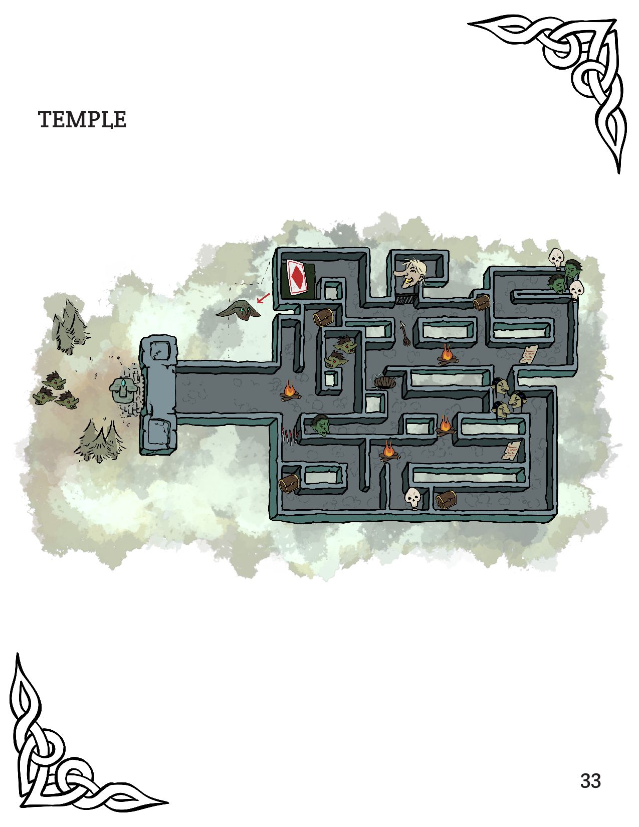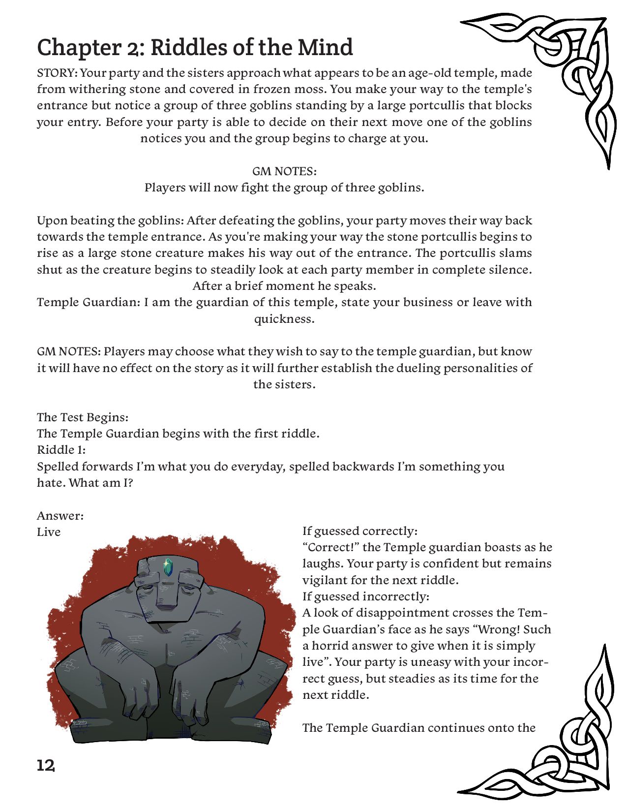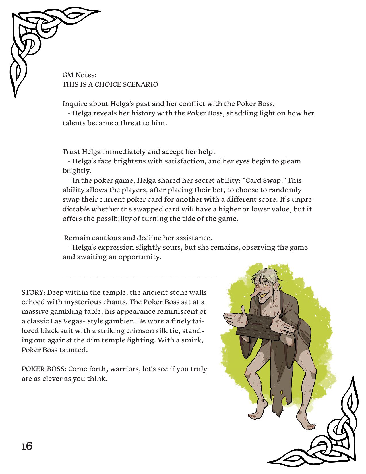 rolling and ruleset. When Urth’s HP reaches 10, the goddess drops the sword blade on the ground, Urth: The final encounter in the depths of the temple, an all powerful god- dess who has been wreaking havoc upon this land as long as anyone can remember. A devilish beast, a commanding personality that will attempt to worm his way into any mind that lets its guard down, allowing her to form the army he has to protect his domain. Deep down inside amongst her massive power, Urth is insecure and quite petty. She is capable of recognizing once she is bested, but if he is not shown the respect she believes she deserves, she will not hesitate to use her last ounces of power to ensure the ruining of the lives that dared cross her. HP: 30 Armor class: 16 To hit bonus: +5 Damage: 1d12 Movement: 60 ft Saving throw: 12 Special: Time Reversion, Reanimation Size: large, 8 ft Treasure: Seed to the Tree of Life (Yggdrasil) Experience: 1000 STORY: After a strong hit that throws off Urth’s grip, the sword blade is dropped to the ground. With no hesitation, the headstrong Lina jumps in to grab the fallen blade. However, as it is too heavy for her alone to handle, she is unable to move, standing right by an enraged Urth’s feet. The Norn takes a powerful swing towards the younger sister. Right on time, Astrid tack- les her sister at full speed, taking them both far enough away from danger. The sisters quickly get back on their feet, running to join the other party members. ASTRID: Let’s see if this works. STORY: Astrid grabs the hilt of The Vengeful Sabel and connects it to the loose blade that Lina has placed on the ground. Almost immediately, like a magnet, the two pieces stuck together, balancing the weight of the overly heavy sword. The Vengeful Sabel was such a mighty sword, that even Astrid knew it was too much for her. ASTRID: It’s okay Lina, you can leave it to me. STORY: Astrid drags the sword on the ground, clearly struggling to wield the weapon appro- priately. The movement of the sword, however, becomes quicker and quicker, speeding up in the direction of Urth. Suddenly, Astrid is now being dragged by the sword. Turns out Urth is rewinding the blade’s position back to where it was before the older sister tackled it away. All the party members are forced to quickly gather behind the helpless Astrid, mustering all their strength to help Lina keep her older sister from being pulled into Urth’s range. 22