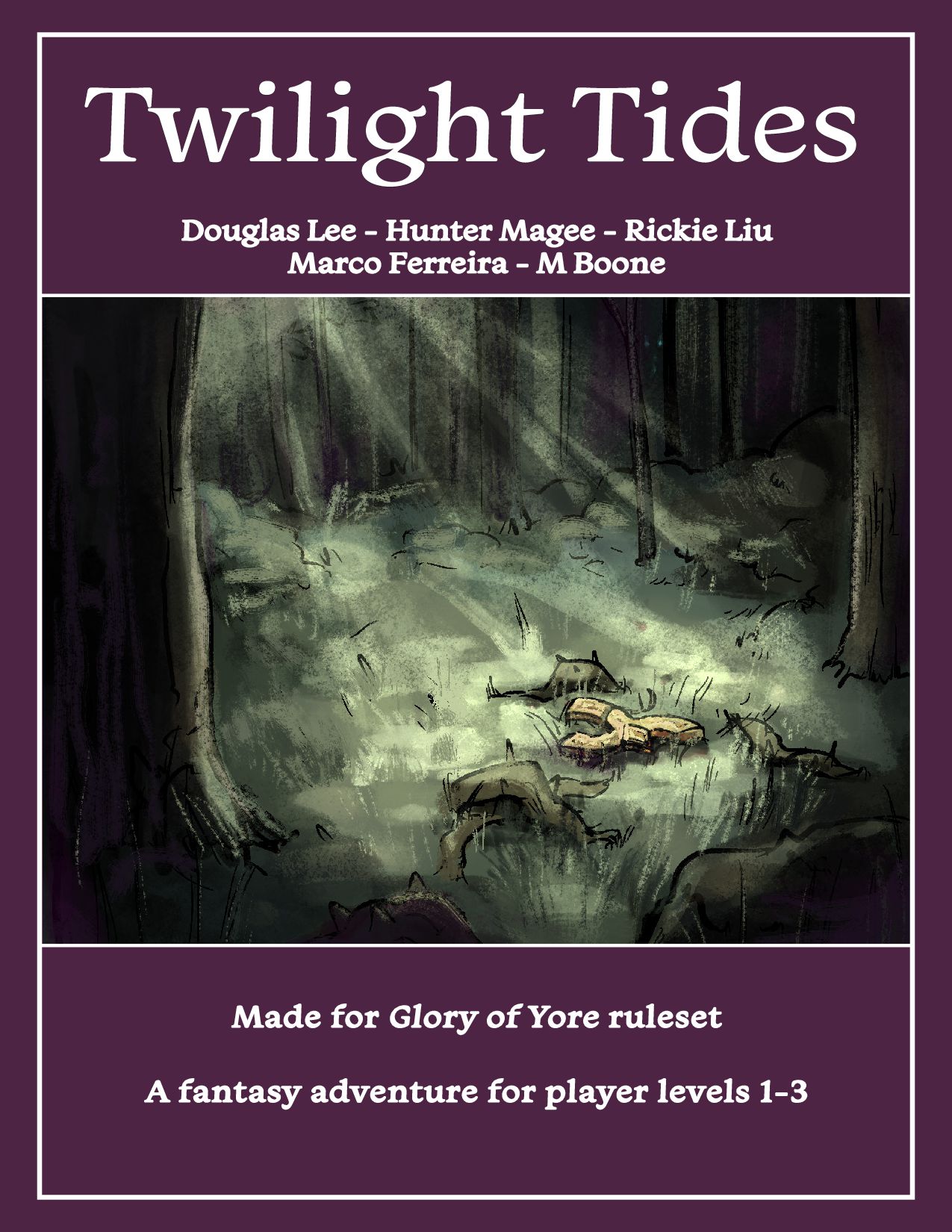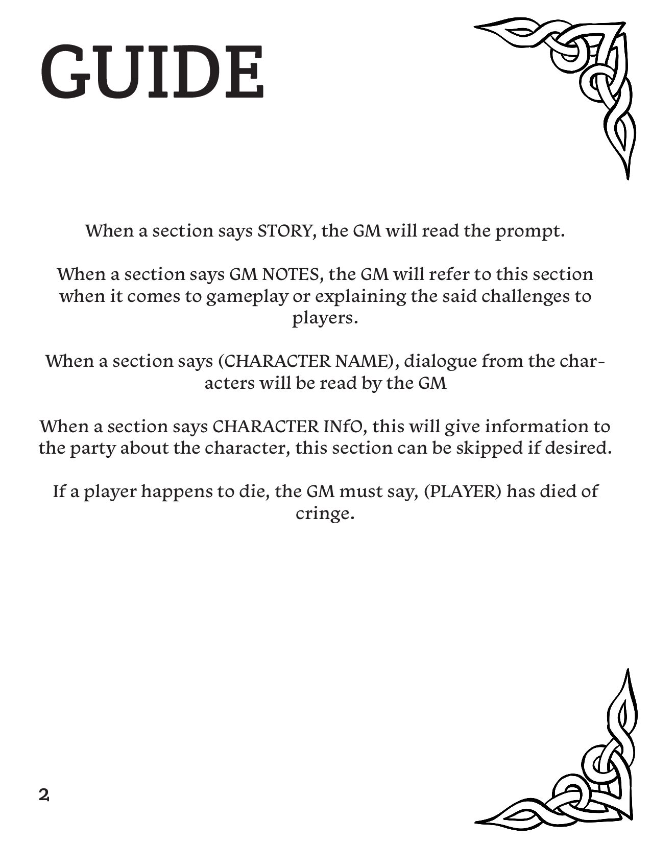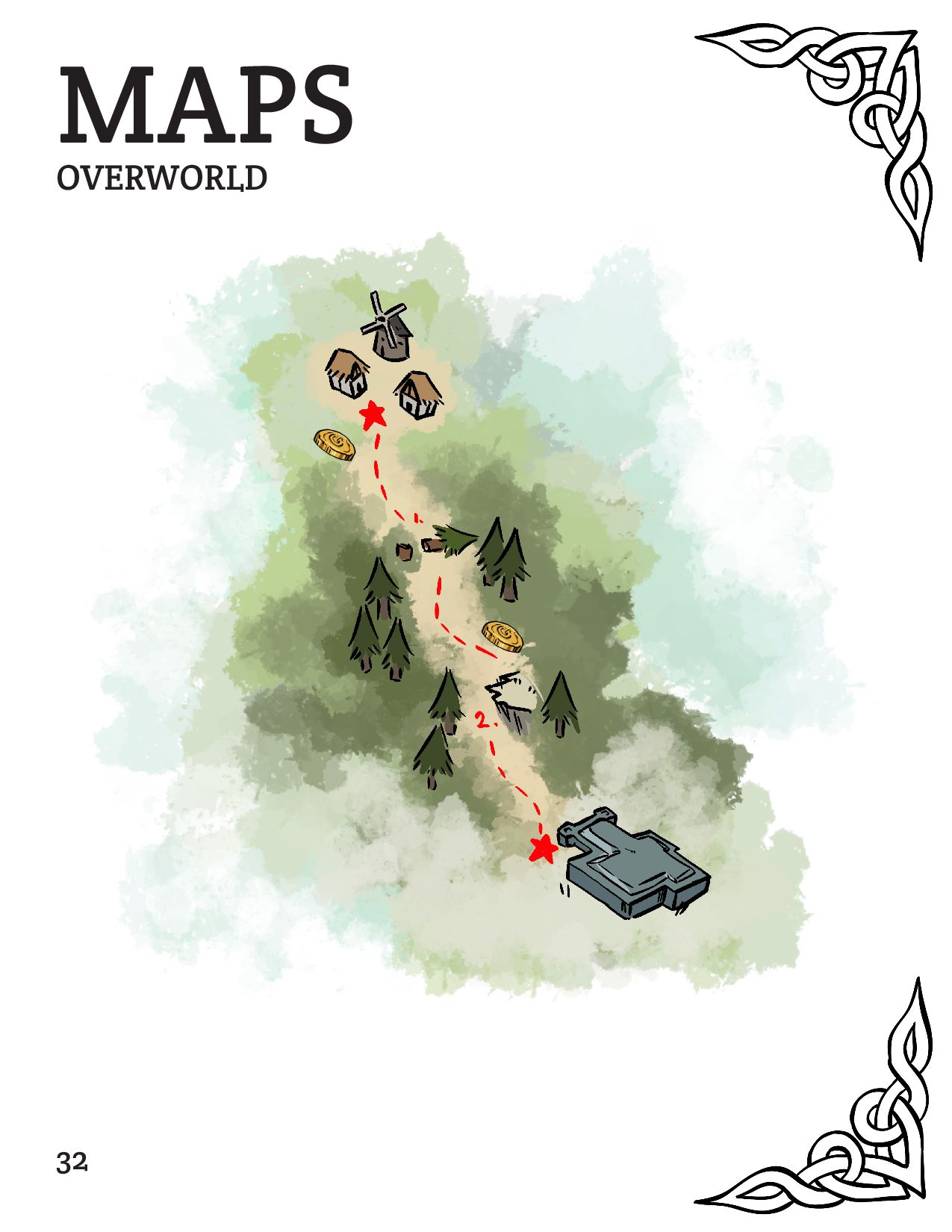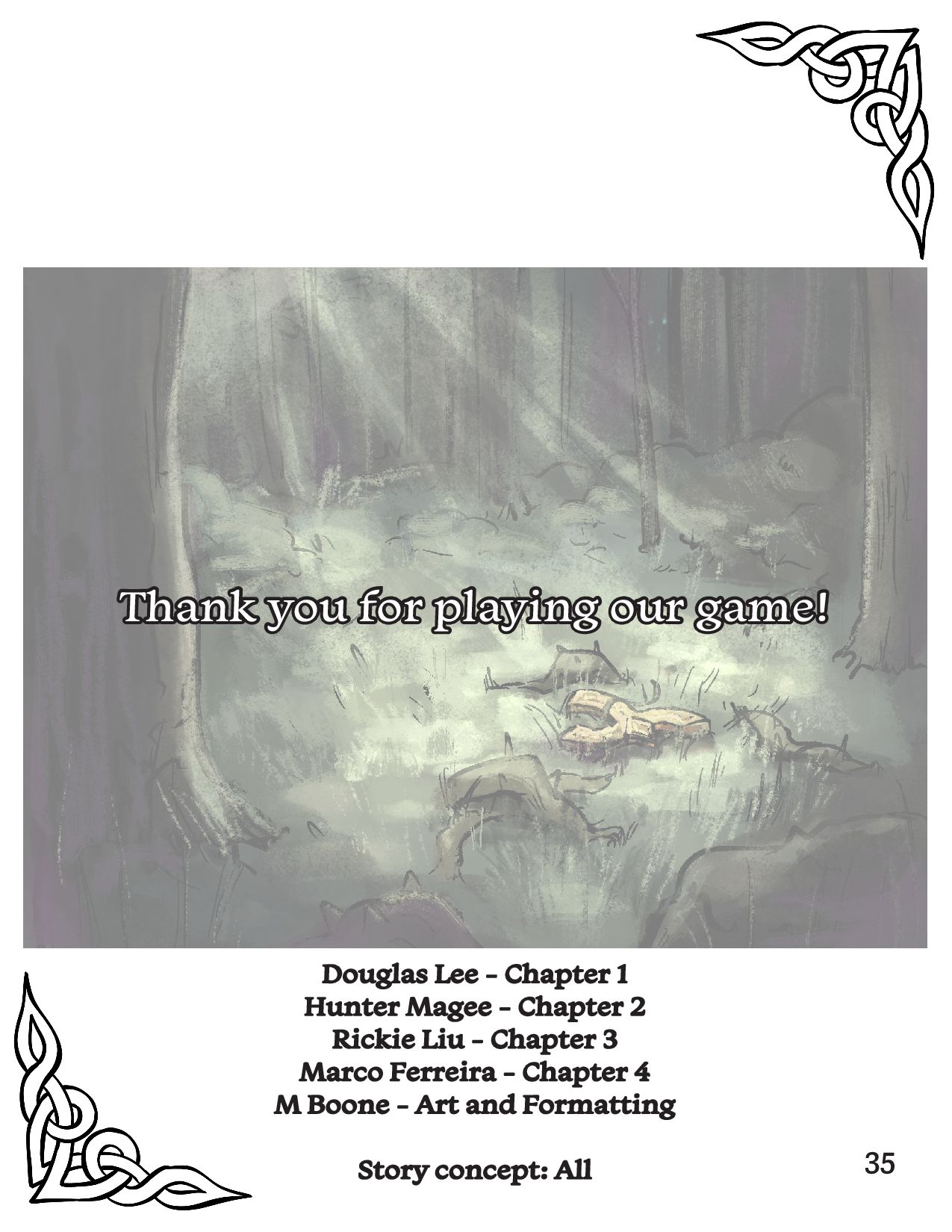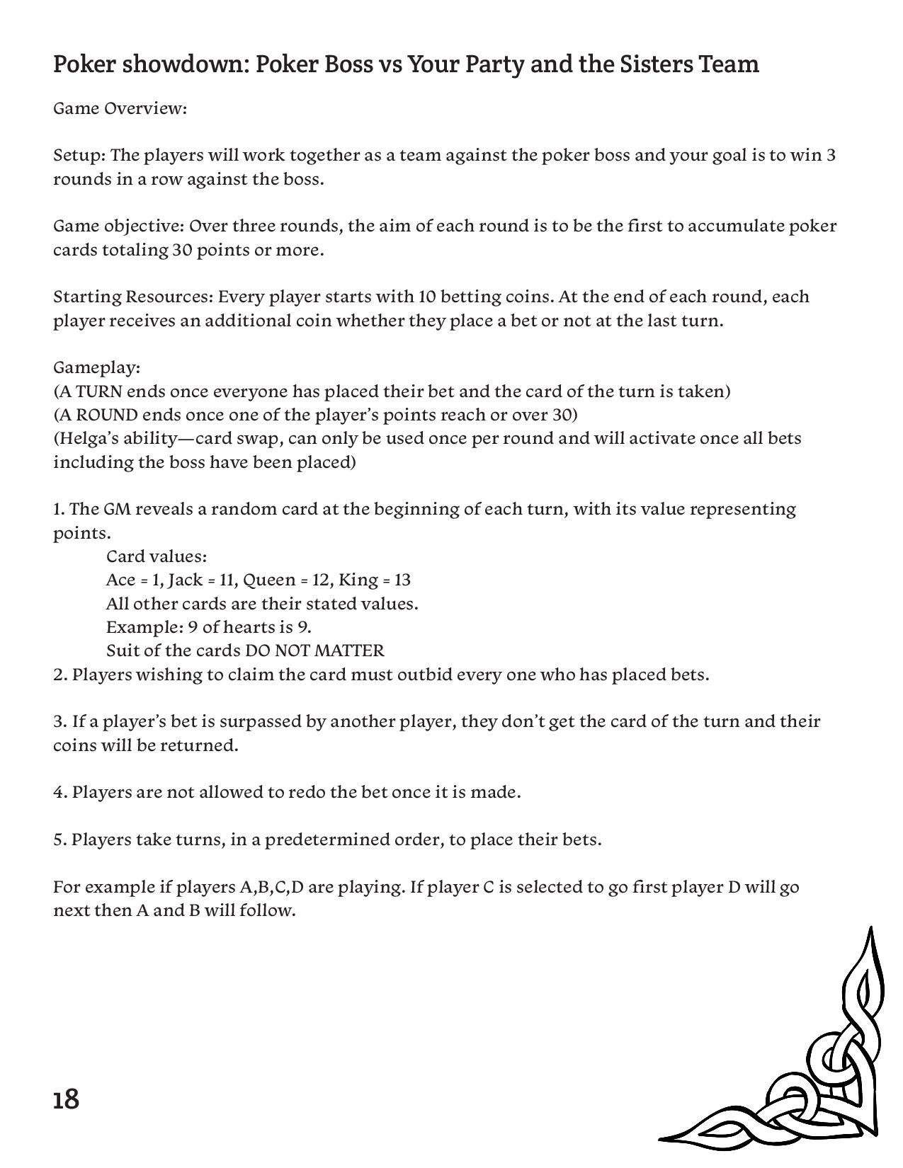 rolling and ruleset. When Urth’s HP reaches 10, the goddess drops the sword blade on the ground, Urth: The final encounter in the depths of the temple, an all powerful god- dess who has been wreaking havoc upon this land as long as anyone can remember. A devilish beast, a commanding personality that will attempt to worm his way into any mind that lets its guard down, allowing her to form the army he has to protect his domain. Deep down inside amongst her massive power, Urth is insecure and quite petty. She is capable of recognizing once she is bested, but if he is not shown the respect she believes she deserves, she will not hesitate to use her last ounces of power to ensure the ruining of the lives that dared cross her. HP: 30 Armor class: 16 To hit bonus: +5 Damage: 1d12 Movement: 60 ft Saving throw: 12 Special: Time Reversion, Reanimation Size: large, 8 ft Treasure: Seed to the Tree of Life (Yggdrasil) Experience: 1000 STORY: After a strong hit that throws off Urth’s grip, the sword blade is dropped to the ground. With no hesitation, the headstrong Lina jumps in to grab the fallen blade. However, as it is too heavy for her alone to handle, she is unable to move, standing right by an enraged Urth’s feet. The Norn takes a powerful swing towards the younger sister. Right on time, Astrid tack- les her sister at full speed, taking them both far enough away from danger. The sisters quickly get back on their feet, running to join the other party members. ASTRID: Let’s see if this works. STORY: Astrid grabs the hilt of The Vengeful Sabel and connects it to the loose blade that Lina has placed on the ground. Almost immediately, like a magnet, the two pieces stuck together, balancing the weight of the overly heavy sword. The Vengeful Sabel was such a mighty sword, that even Astrid knew it was too much for her. ASTRID: It’s okay Lina, you can leave it to me. STORY: Astrid drags the sword on the ground, clearly struggling to wield the weapon appro- priately. The movement of the sword, however, becomes quicker and quicker, speeding up in the direction of Urth. Suddenly, Astrid is now being dragged by the sword. Turns out Urth is rewinding the blade’s position back to where it was before the older sister tackled it away. All the party members are forced to quickly gather behind the helpless Astrid, mustering all their strength to help Lina keep her older sister from being pulled into Urth’s range. 22