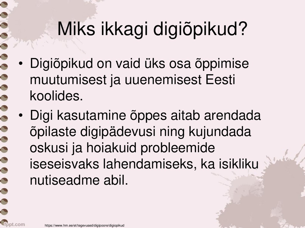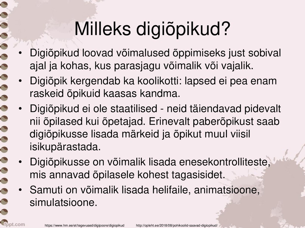töövihik ja vihik ühes. See on keskkond, mis pakub uusi teadmisi juba õpitu kohta, võimalust uurida rohkem ja süvitsi, täita ülesandeid, saada tagasisidet ja iseseisvalt edasi õppida. • Võrreldes paberõpikutega saab digiõpikutes luua erinevate õppeainete, teemade, klasside ja kursuste vahel paremaid ja vahetumaid seoseid. • Digiõpikud muudavad koolikoti kergemaks, kuna edaspidi piisab kõikide õpikute kasutamiseks vaid ühest nutiseadmest. https://www.hm.ee/et/tegevused/digipoore/digiopikud