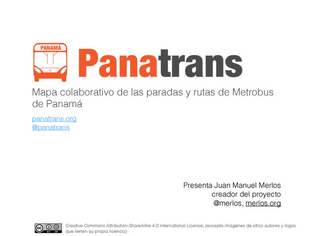 Panamá ! ! Presenta Juan Manuel Merlos creador del proyecto @merlos, merlos.org panatrans.org @panatrans Creative Commons Attribution-ShareAlike 4.0 International License, (excepto imágenes de otros autores y logos que tienen su propia licencia)