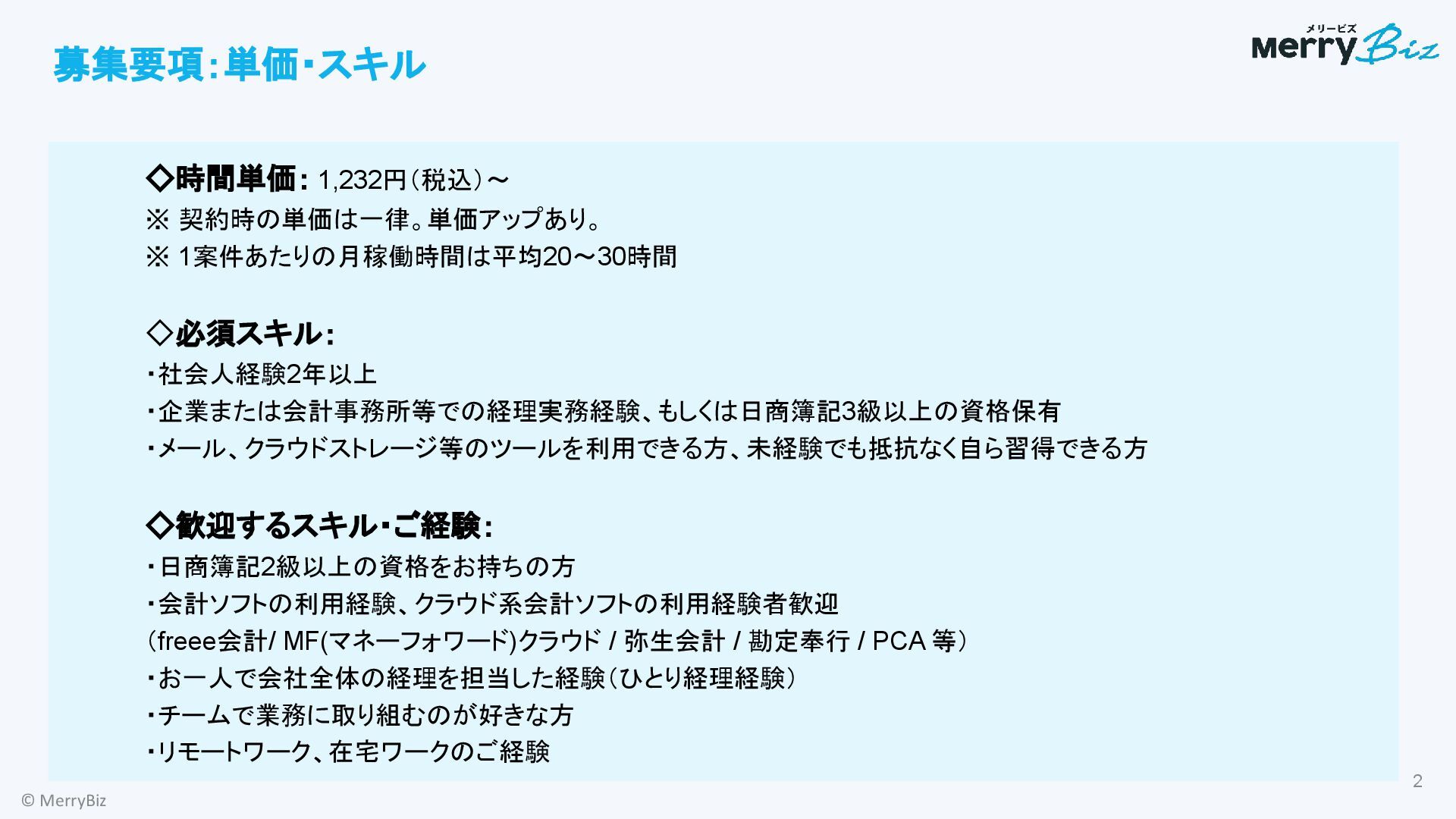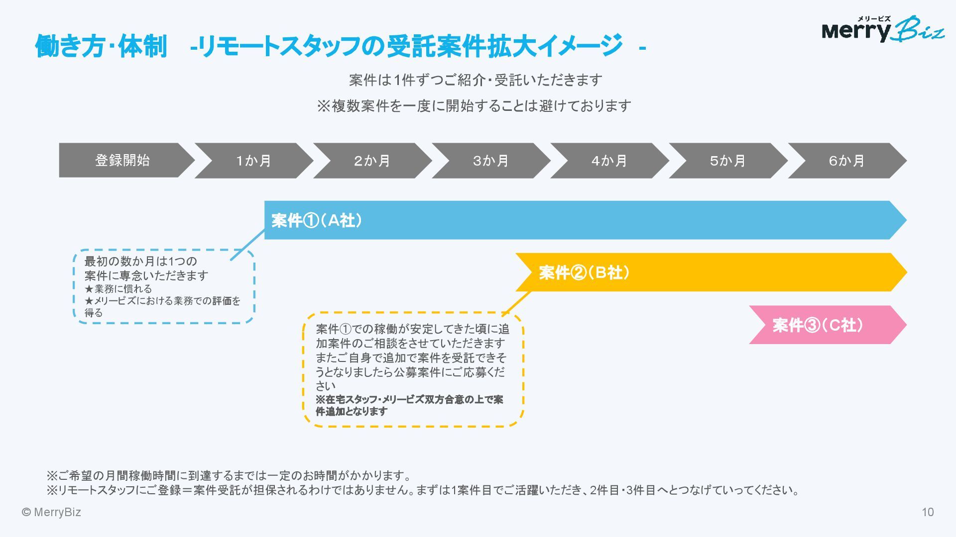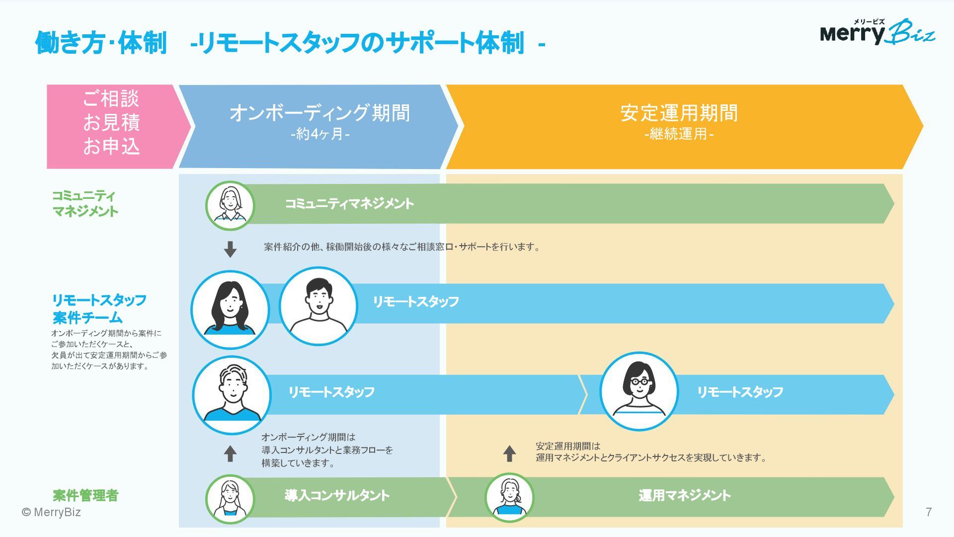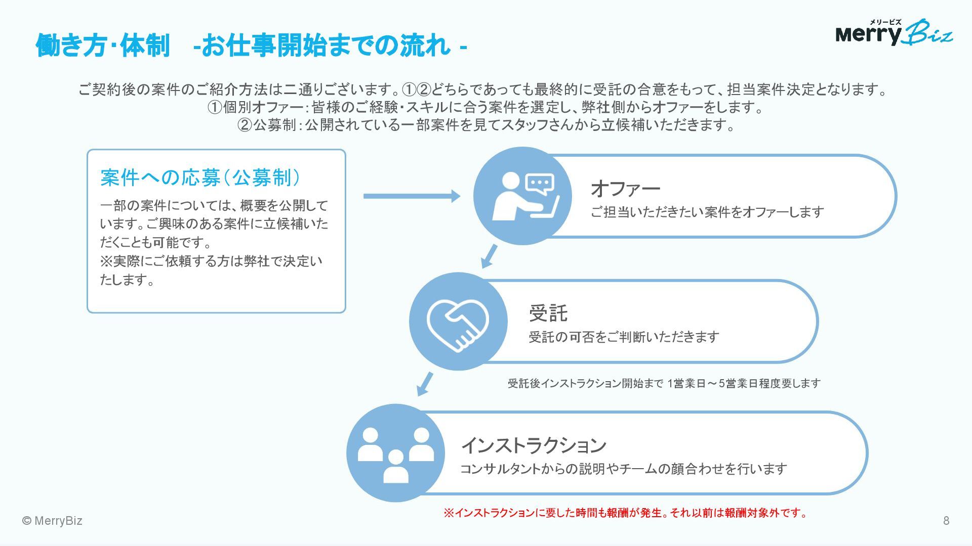 コミュニティ マネジメント 案件管理者 運用マネジメント 導入コンサルタント リモートスタッフ 案件チーム リモートスタッフ リモートスタッフ リモートスタッフ オンボーディング期間から案件に ご参加いただくケースと、 欠員が出て安定運用期間からご参 加いただくケースがあります。 案件紹介の他、稼働開始後の様々なご相談窓口・サポートを行います。 コミュニティマネジメント 安定運用期間は 運用マネジメントとクライアントサクセスを実現していきます。 オンボーディング期間は 導入コンサルタントと業務フローを 構築していきます。 © MerryBiz 7