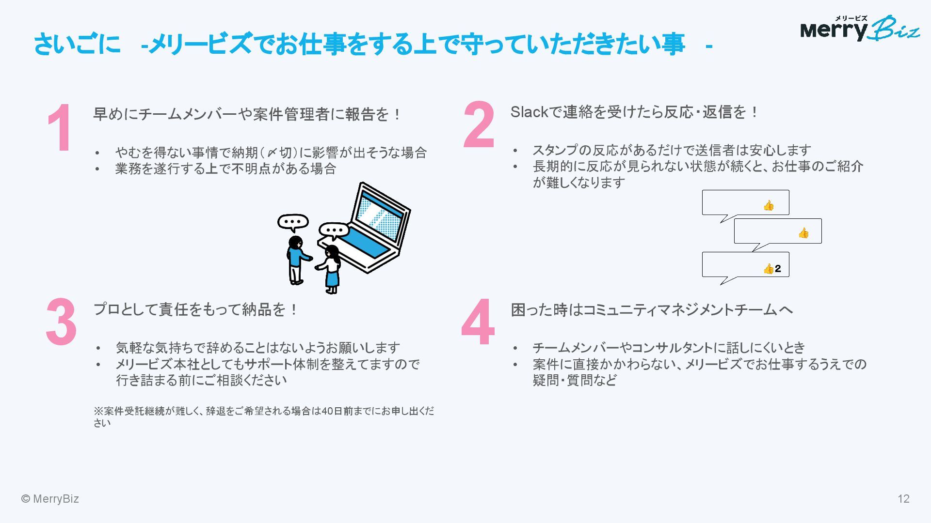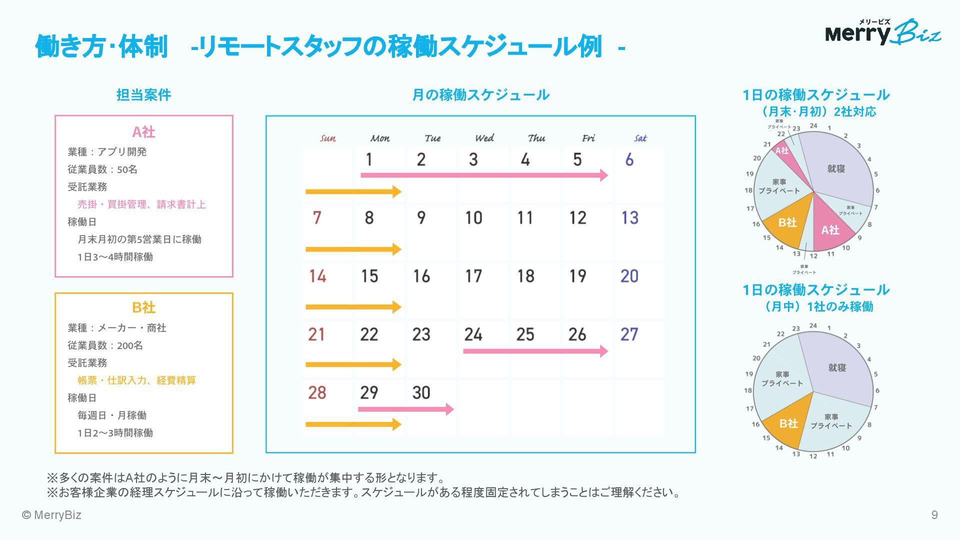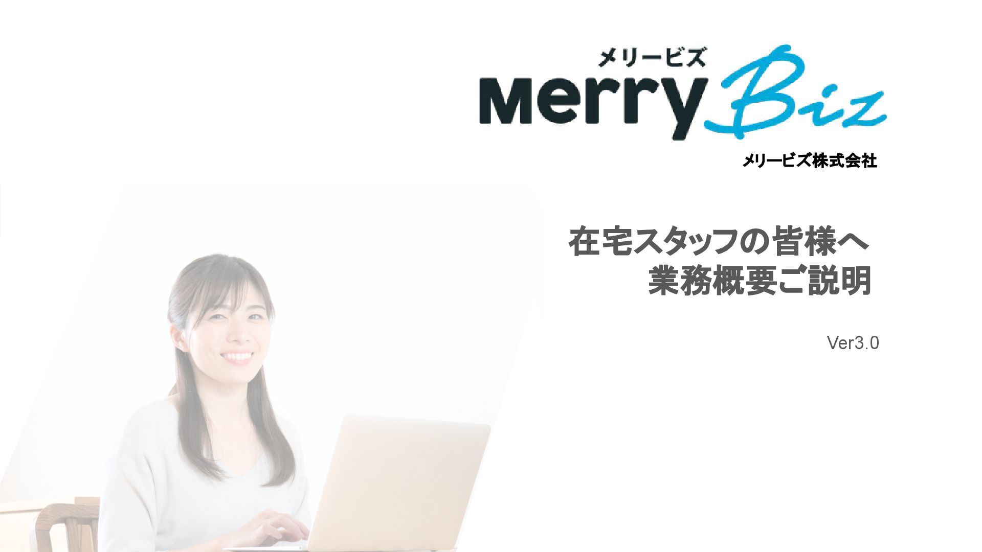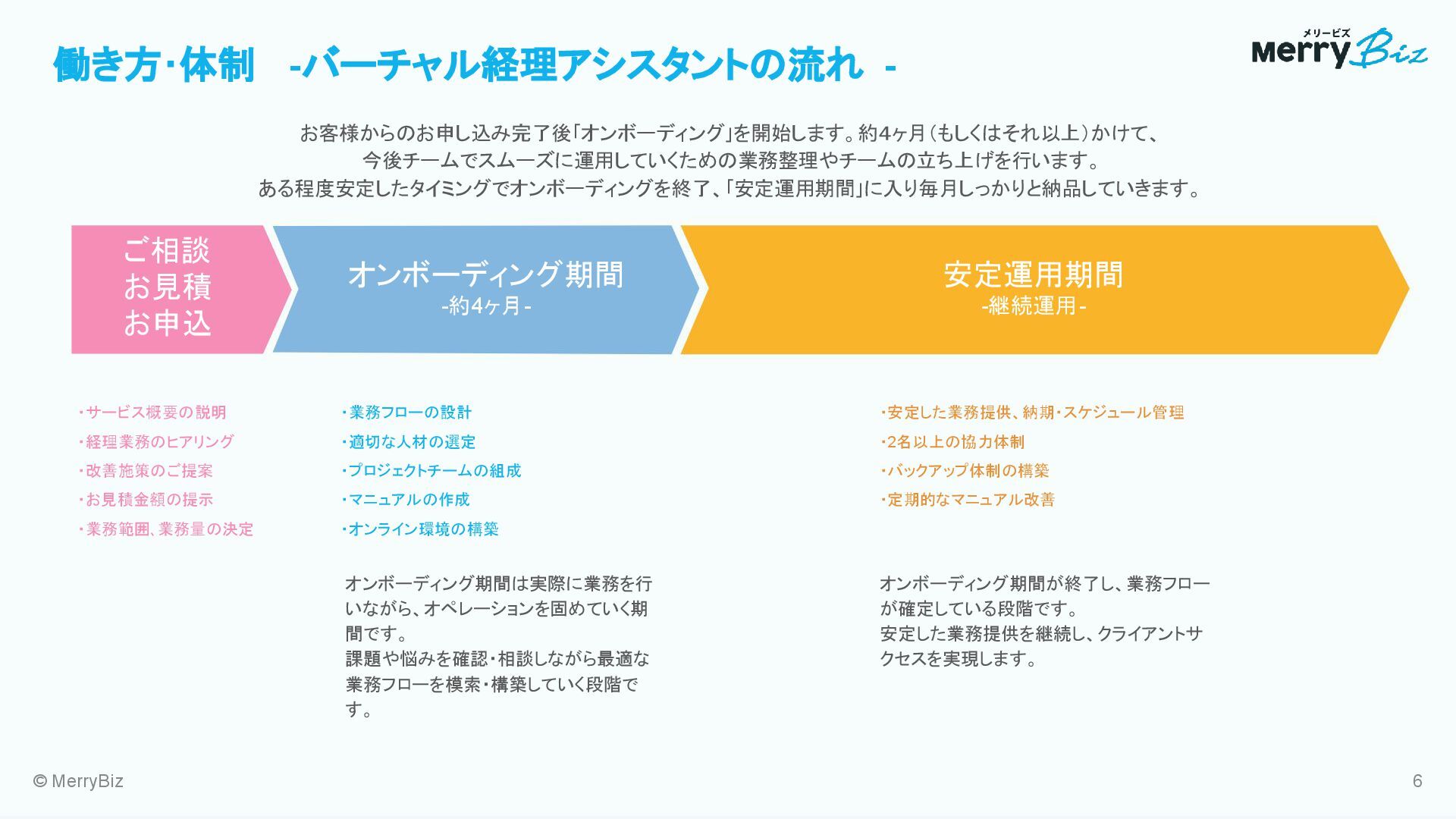 コミュニティ マネジメント 案件管理者 運用マネジメント 導入コンサルタント リモートスタッフ 案件チーム リモートスタッフ リモートスタッフ リモートスタッフ オンボーディング期間から案件に ご参加いただくケースと、 欠員が出て安定運用期間からご参 加いただくケースがあります。 案件紹介の他、稼働開始後の様々なご相談窓口・サポートを行います。 コミュニティマネジメント 安定運用期間は 運用マネジメントとクライアントサクセスを実現していきます。 オンボーディング期間は 導入コンサルタントと業務フローを 構築していきます。 © MerryBiz 7