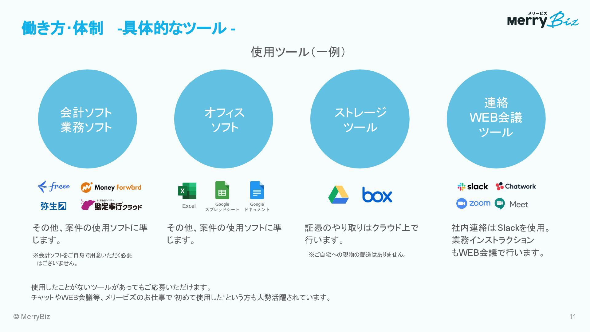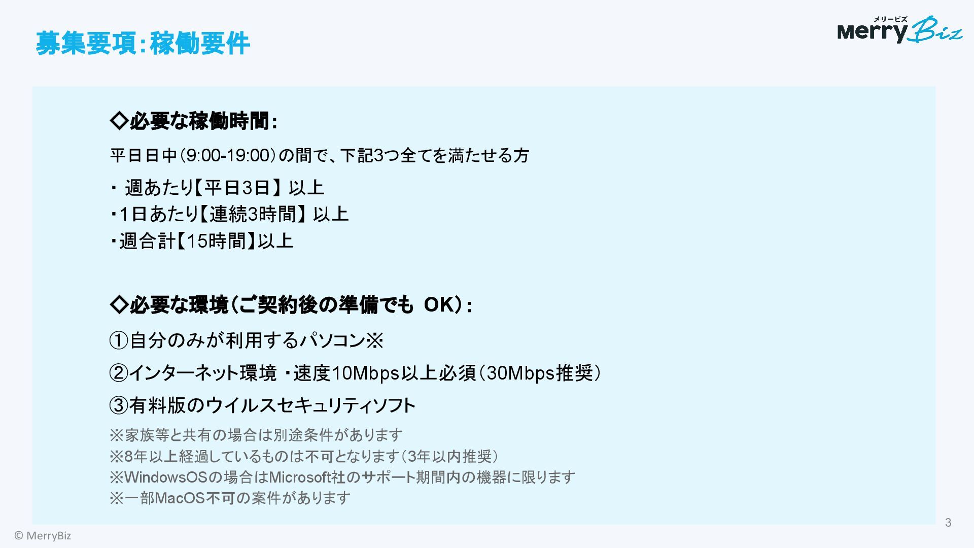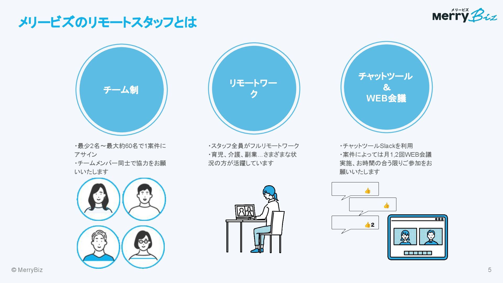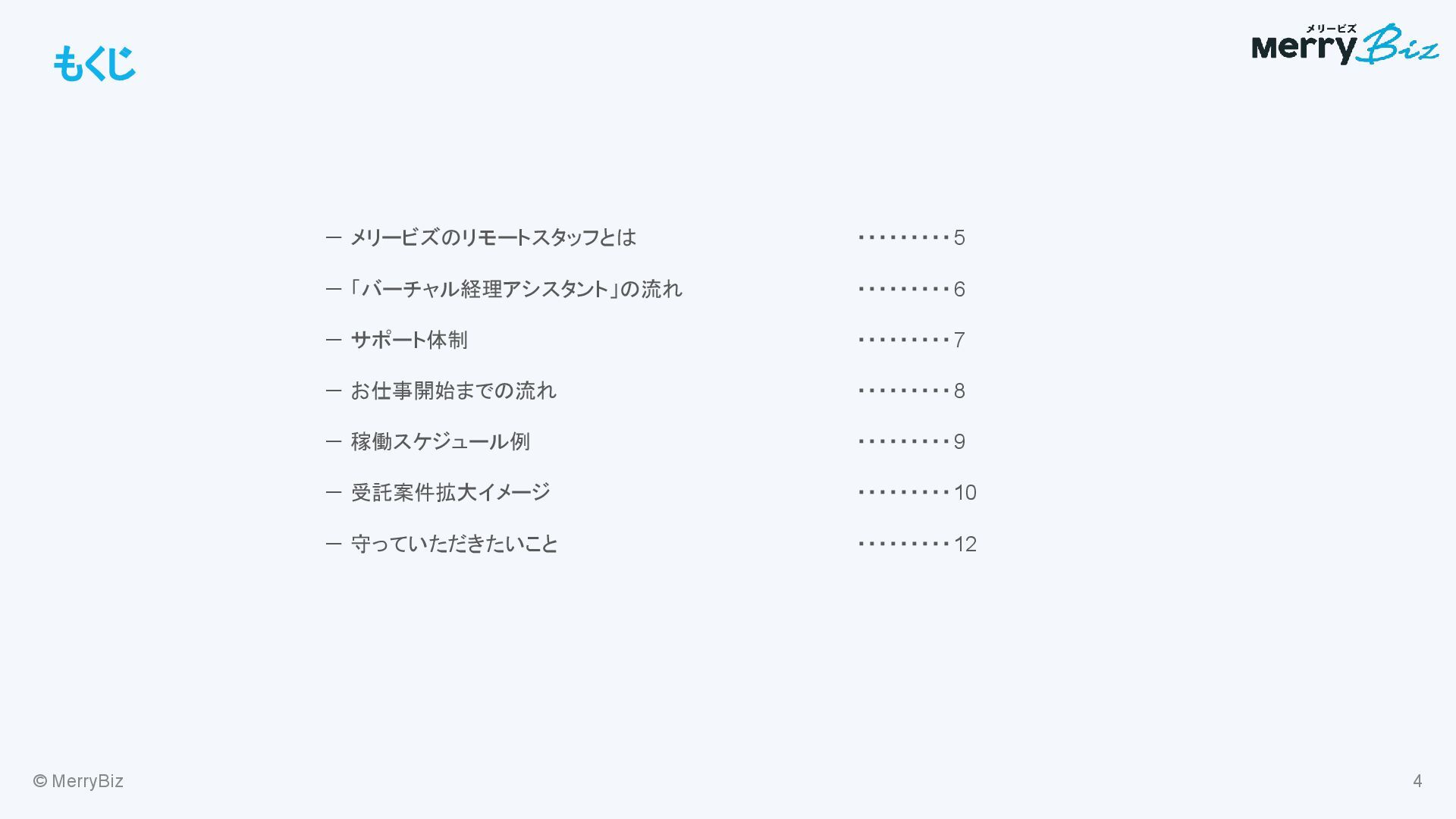 コミュニティ マネジメント 案件管理者 運用マネジメント 導入コンサルタント リモートスタッフ 案件チーム リモートスタッフ リモートスタッフ リモートスタッフ オンボーディング期間から案件に ご参加いただくケースと、 欠員が出て安定運用期間からご参 加いただくケースがあります。 案件紹介の他、稼働開始後の様々なご相談窓口・サポートを行います。 コミュニティマネジメント 安定運用期間は 運用マネジメントとクライアントサクセスを実現していきます。 オンボーディング期間は 導入コンサルタントと業務フローを 構築していきます。 © MerryBiz 7