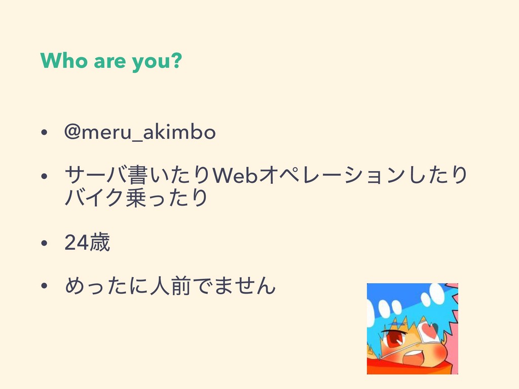 Who are you? • @meru_akimbo • αʔόॻ͍ͨΓWebΦϖϨʔγϣϯͨ͠Γ όΠΫͬͨΓ • 24ࡀ