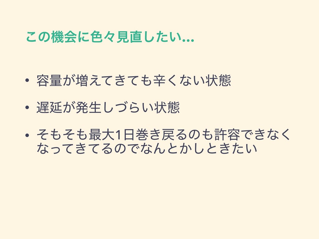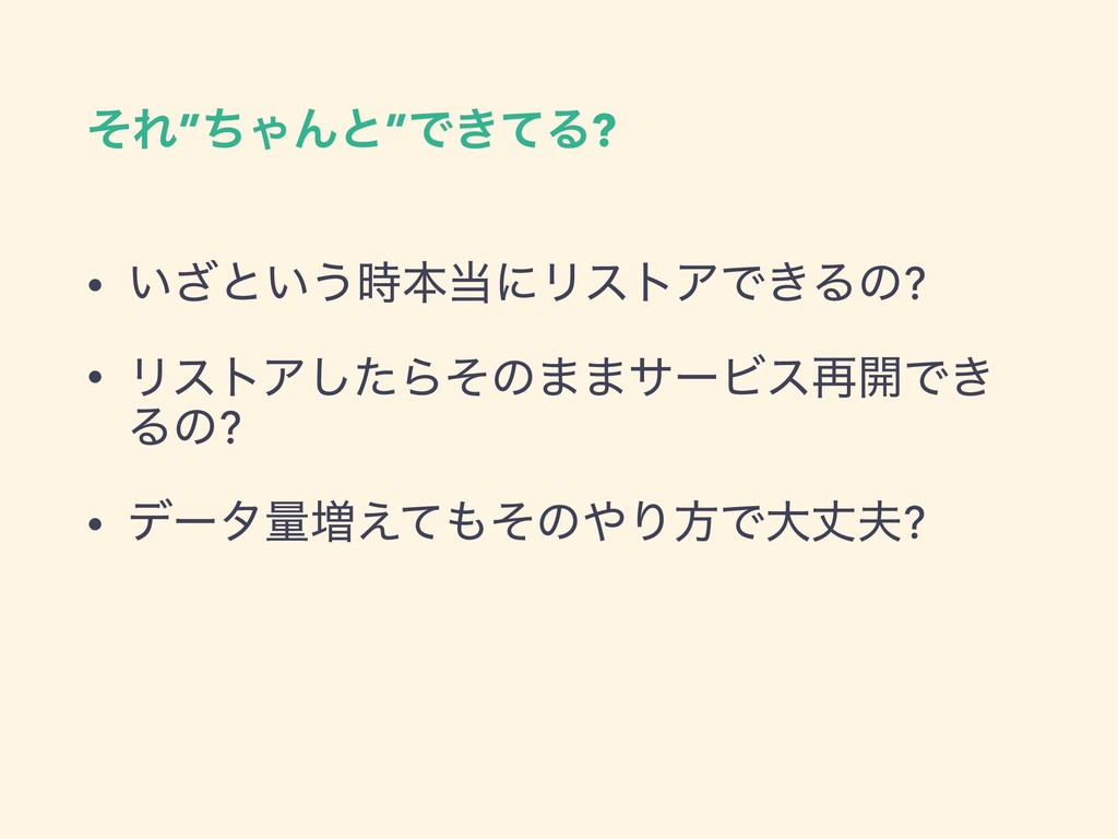 ͦΕ”ͪΌΜͱ”Ͱ͖ͯΔ? • ͍͟ͱ͍͏࣌ຊʹϦετΞͰ͖Δͷ? • ϦετΞͨ͠Βͦͷ··αʔϏε࠶։Ͱ͖ Δͷ? • σʔλྔ૿͑ͯͦͷΓํͰେৎ?