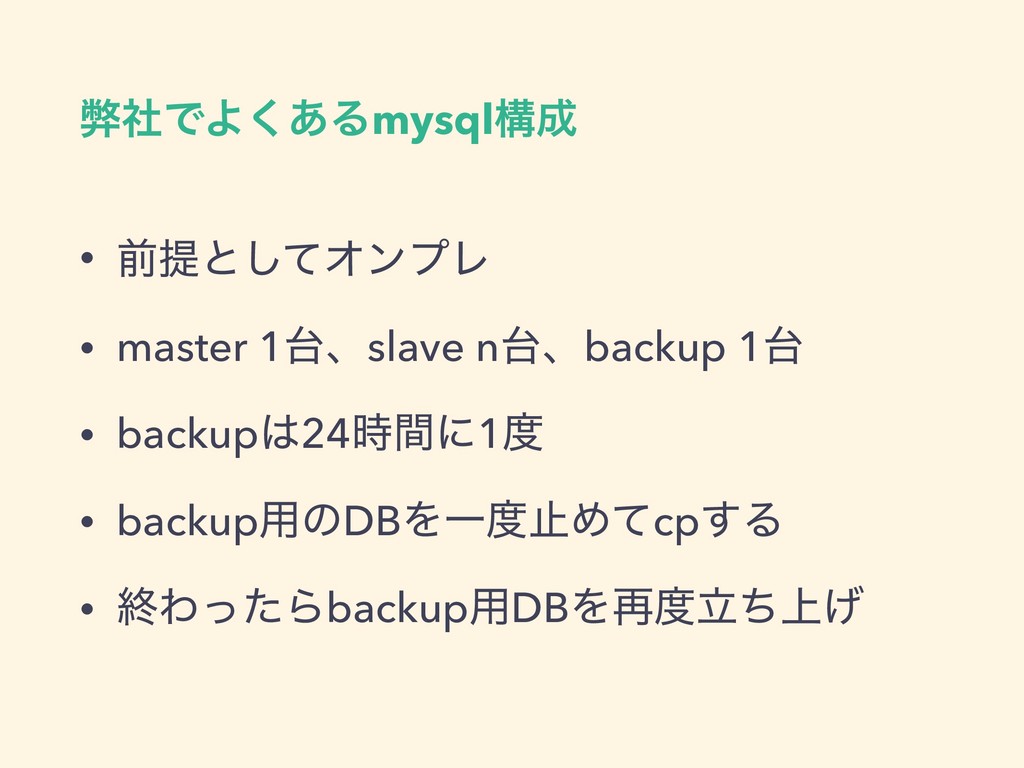 ฐࣾͰΑ͋͘Δmysqlߏ • લఏͱͯ͠ΦϯϓϨ • master 1ɺslave nɺbackup 1 • backup24࣌ؒʹ1