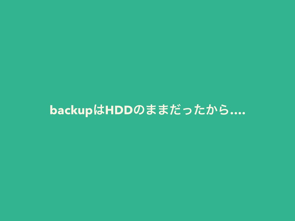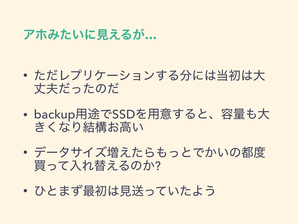 ΞϗΈ͍ͨʹݟ͑Δ͕… • ͨͩϨϓϦέʔγϣϯ͢Δʹॳେ ৎͩͬͨͷͩ • backup༻్ͰSSDΛ༻ҙ͢Δͱɺ༰ྔେ ͖͘ͳΓ݁ߏ͓ߴ͍ • σʔλαΠζ૿͑ͨΒͬͱͰ͔͍ͷ ങͬͯೖΕସ͑Δͷ͔?