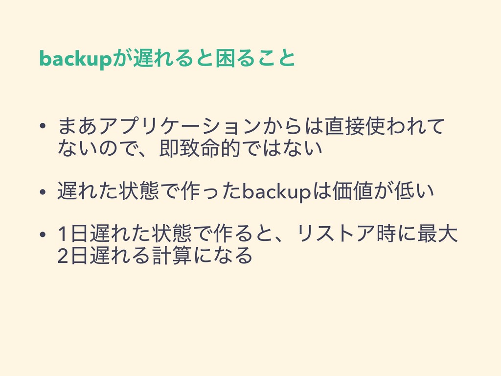 backup͕ΕΔͱࠔΔ͜ͱ • ·͋ΞϓϦέʔγϣϯ͔ΒΘΕͯ ͳ͍ͷͰɺଈக໋తͰͳ͍ • Εͨঢ়ଶͰ࡞ͬͨbackupՁ͕͍ • 1Εͨঢ়ଶͰ࡞ΔͱɺϦετΞ࣌ʹ࠷େ 2ΕΔܭࢉʹͳΔ