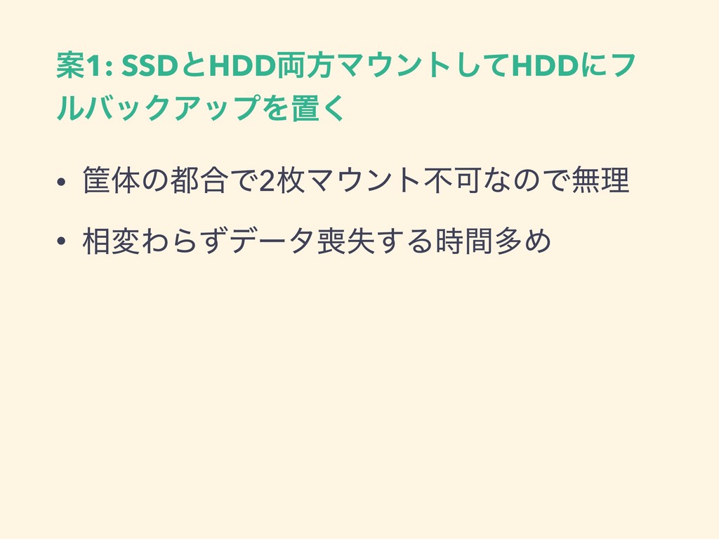 Ҋ1: SSDͱHDD྆ํϚϯτͯ͠HDDʹϑ ϧόοΫΞοϓΛஔ͘ • ᝑମͷ߹Ͱ2ຕϚϯτෆՄͳͷͰແཧ • ૬มΘΒͣσʔλࣦ͢Δ࣌ؒଟΊ