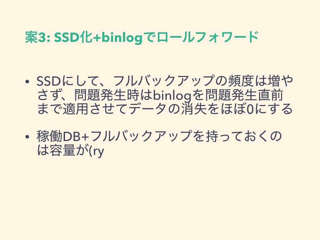 Ҋ3: SSDԽ+binlogͰϩʔϧϑΥϫʔυ • SSDʹͯ͠ɺϑϧόοΫΞοϓͷස૿ ͣ͞ɺൃੜ࣌binlogΛൃੜલ ·Ͱద༻ͤͯ͞σʔλͷফࣦΛ΄΅0ʹ͢Δ • ՔಇDB+ϑϧόοΫΞοϓΛ͓࣋ͬͯ͘ͷ ༰ྔ͕(ry