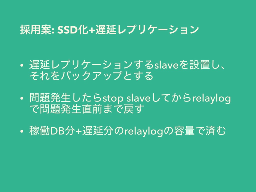 ࠾༻Ҋ: SSDԽ+ԆϨϓϦέʔγϣϯ • ԆϨϓϦέʔγϣϯ͢ΔslaveΛઃஔ͠ɺ ͦΕΛόοΫΞοϓͱ͢Δ • ൃੜͨ͠Βstop slave͔ͯ͠Βrelaylog Ͱൃੜલ·Ͱ͢ •