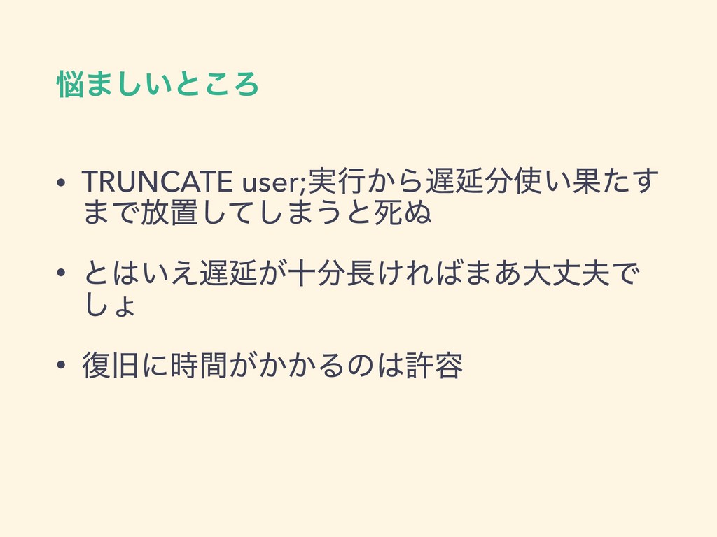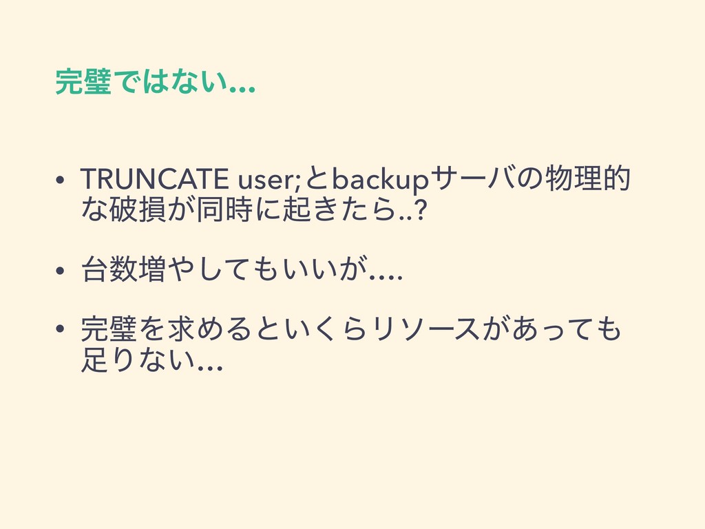 ᘳͰͳ͍… • TRUNCATE user;ͱbackupαʔόͷཧత ͳഁଛ͕ಉ࣌ʹى͖ͨΒ..? • ૿͍͍͕ͯ͠…. • ᘳΛٻΊΔͱ͍͘ΒϦιʔε͕͋ͬͯ Γͳ͍…
