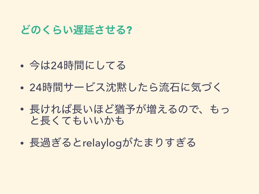 Ͳͷ͘Β͍Ԇͤ͞Δ? • ࠓ24࣌ؒʹͯ͠Δ • 24࣌ؒαʔϏεͨ͠Βྲྀੴʹؾͮ͘ • ͚Ε͍΄Ͳ༛༧͕૿͑ΔͷͰɺͬ ͱ͍͍͔ͯ͘ • ա͗Δͱrelaylog͕ͨ·Γ͗͢Δ