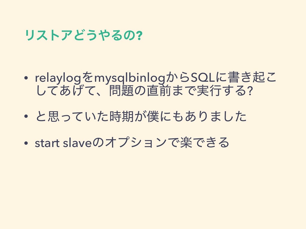 ϦετΞͲ͏Δͷ? • relaylogΛmysqlbinlog͔ΒSQLʹॻ͖ى͜ ͯ͋͛ͯ͠ɺͷલ·Ͱ࣮ߦ͢Δ? • ͱࢥ͍ͬͯͨ࣌ظ͕ʹ͋Γ·ͨ͠ • start slaveͷΦϓγϣϯͰָͰ͖Δ