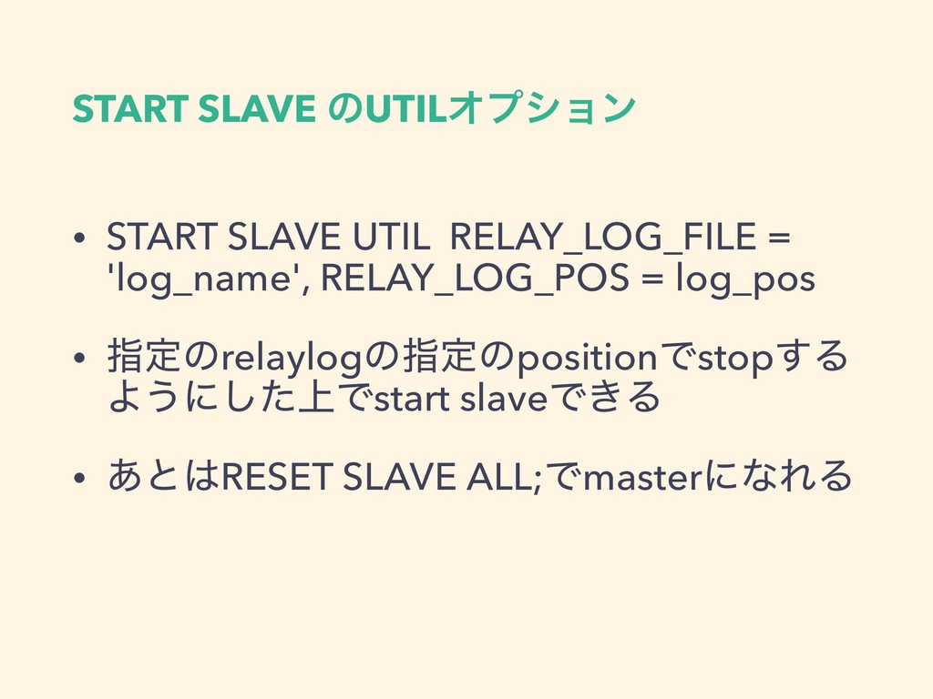 START SLAVE ͷUTILΦϓγϣϯ • START SLAVE UTIL RELAY_LOG_FILE = 'log_name',