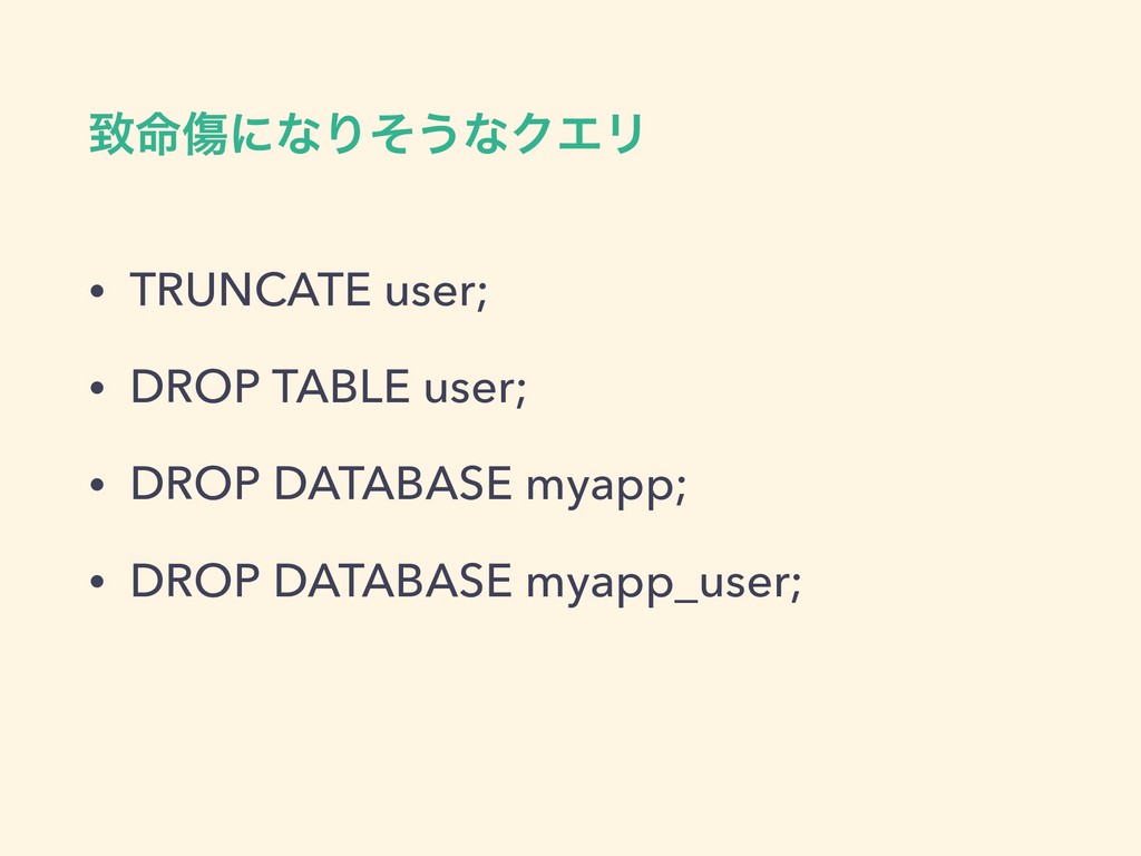 க໋ইʹͳΓͦ͏ͳΫΤϦ • TRUNCATE user; • DROP TABLE user; • DROP