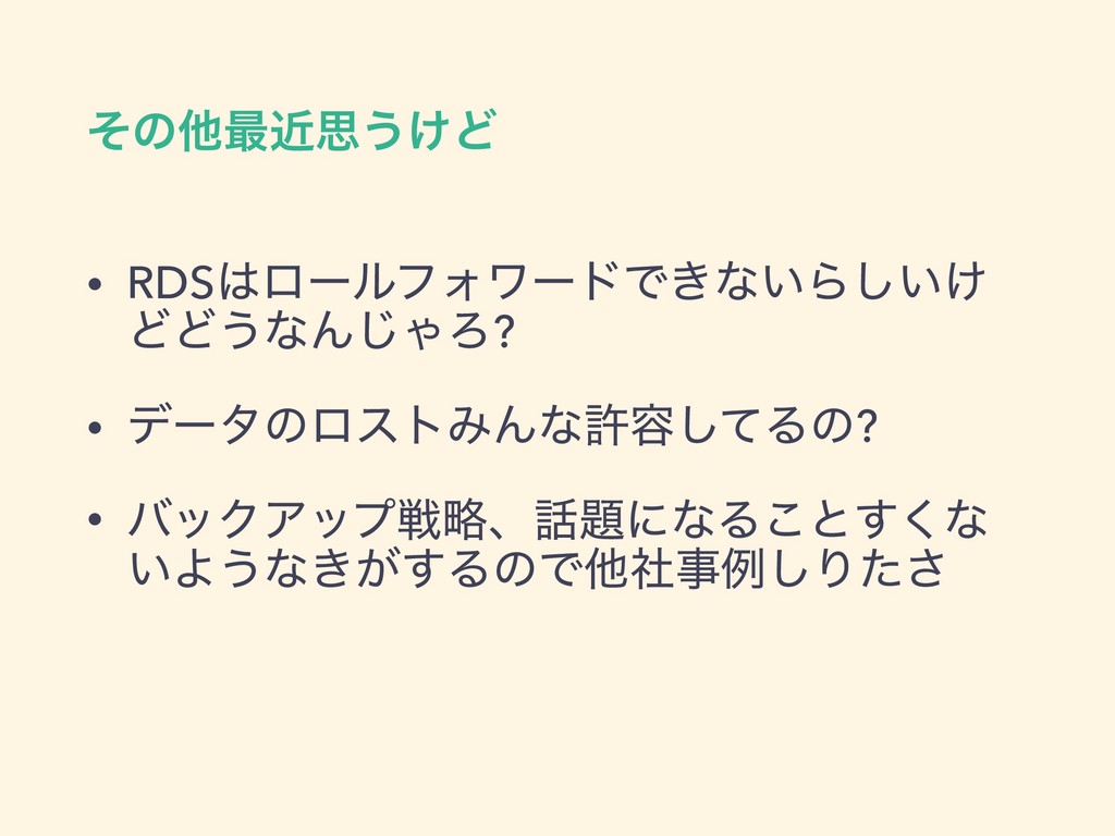 ͦͷଞ࠷ۙࢥ͏͚Ͳ • RDSϩʔϧϑΥϫʔυͰ͖ͳ͍Β͍͚͠ ͲͲ͏ͳΜ͡ΌΖ? • σʔλͷϩετΈΜͳڐ༰ͯ͠Δͷ? • όοΫΞοϓઓུɺʹͳΔ͜ͱ͘͢ͳ ͍Α͏ͳ͖͕͢ΔͷͰଞࣾࣄྫ͠Γͨ͞