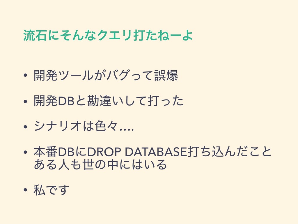 ྲྀੴʹͦΜͳΫΤϦଧͨͶʔΑ • ։ൃπʔϧ͕όάͬͯޡര • ։ൃDBͱצҧ͍ͯ͠ଧͬͨ • γφϦΦ৭ʑ…. • ຊ൪DBʹDROP DATABASEଧͪࠐΜͩ͜ͱ