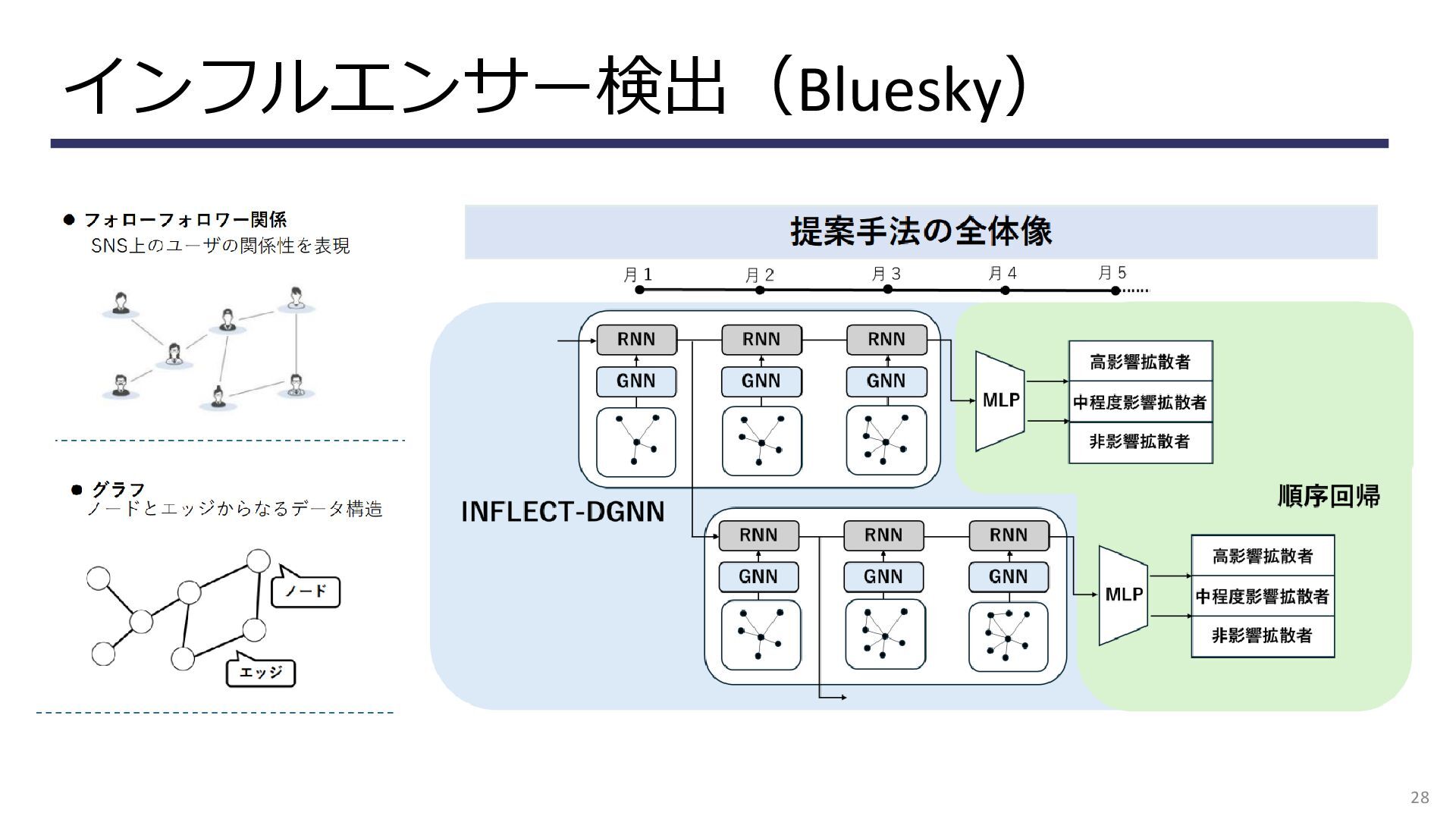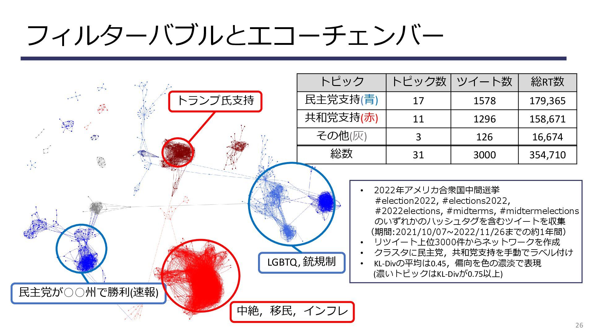 共和党支持(赤) 11 1296 158,671 その他(灰) 3 126 16,674 総数 31 3000 354,710 • 2022年アメリカ合衆国中間選挙 #election2022, #elections2022, #2022elections, #midterms, #midtermelections のいずれかのハッシュタグを含むツイートを収集 (期間:2021/10/07~2022/11/26までの約1年間) • リツイート上位3000件からネットワークを作成 • クラスタに民主党,共和党支持を手動でラベル付け • KL-Divの平均は0.45,偏向を色の濃淡で表現 (濃いトピックはKL-Divが0.75以上) 民主党が◦◦州で勝利(速報) トランプ氏支持 LGBTQ, 銃規制 中絶,移民,インフレ