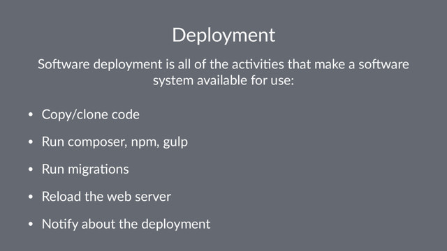 a so#ware system available for use: • Copy/clone code • Run composer, npm, gulp • Run migra6ons • Reload the web server • No6fy about the deployment