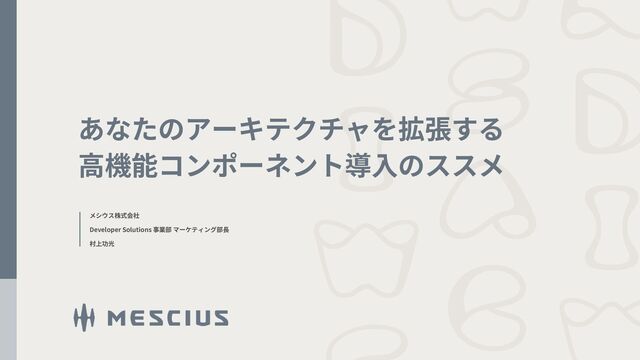 「あなたのアーキテクチャを拡張する高機能コンポーネント導入のススメ」 メシウス株式会社(旧:グレープシティ株式会社) Developer Solutions事業部 マーケティング部長:村上 功光