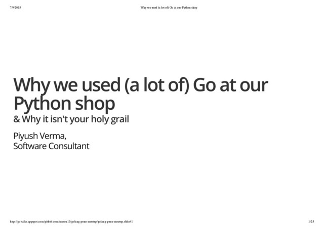 Python shop http://go-talks.appspot.com/github.com/meson10/golang-pune-meetup/golang-pune-meetup.slide#1 22/25 Deal with it, know what you want. You would see a lot of articles about Golang being bad or weak. The FAQ of the language answers most of why it does not support a feature. Know your requirements, understand the limitations or conventions, and if you go ahead with it deal with it. Yes, the language does not have generics and that can lead to verbose code writing or having to use lot of reflection or code generation. Well, we do that because we want to deal with those :-) There is always an explicit, verbose and simpler way around it, and coming from Python that definitely matches the *Zen of python*