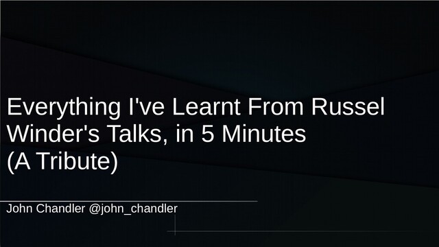 PyConUK 2019 lightning talk. Russel Winder has been a participant at every PyConUK, but was unable to attend the 2019 conference. His presence was sorely missed, and this light-hearted tribute attempted to distill the key points of his previous talks. Although the talk had a lack of squirrels.