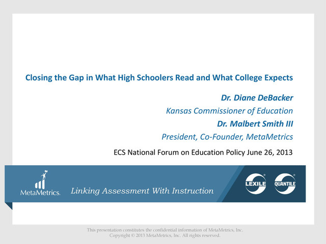 Presented by: Dr. Diane DeBacker, Commissioner of Education, Kansas Department of Education and Dr. Malbert Smith President, MetaMetrics, Inc
