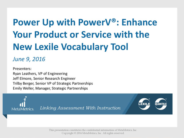 Join us as we unveil PowerV®, our new Lexile Vocabulary Tool! With PowerV, vocabulary lists can be generated within desired Lexile ranges for a specific book or piece of text. PowerV is also able to identify important vocabulary words that a student will encounter in a book or text that are customized to his or her reading ability or filtered based on difficulty. During this webinar: