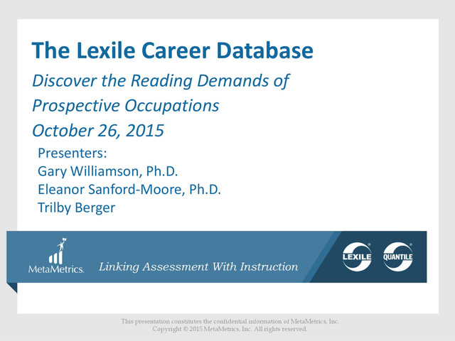 The Lexile Career Database is now available and can be integrated into your product or service. The Lexile Career Database offers Lexile® measures for over 185 careers from the 16 career clusters, as well as important descriptive information for each career. Attend our informational webinar to learn about: