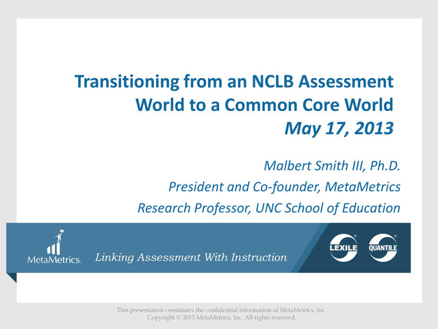Presentation from National Conference on Common Core Readiness: Assessments May 17, 2013 Chicago, Illinois Presented by: Dr. Malbert Smith III MetaMetrics, Inc