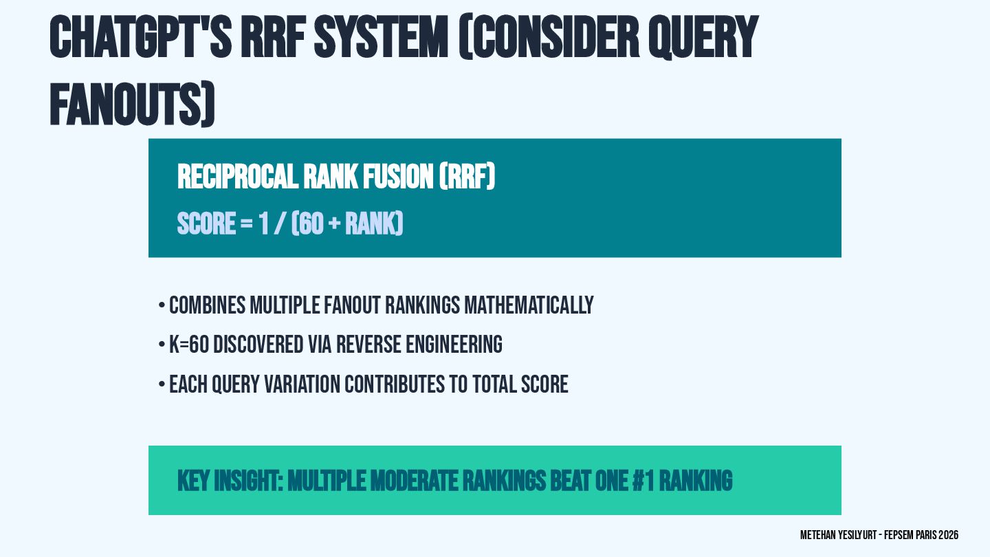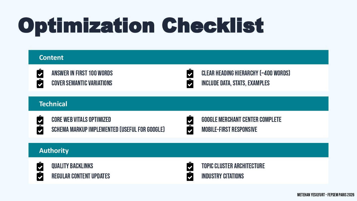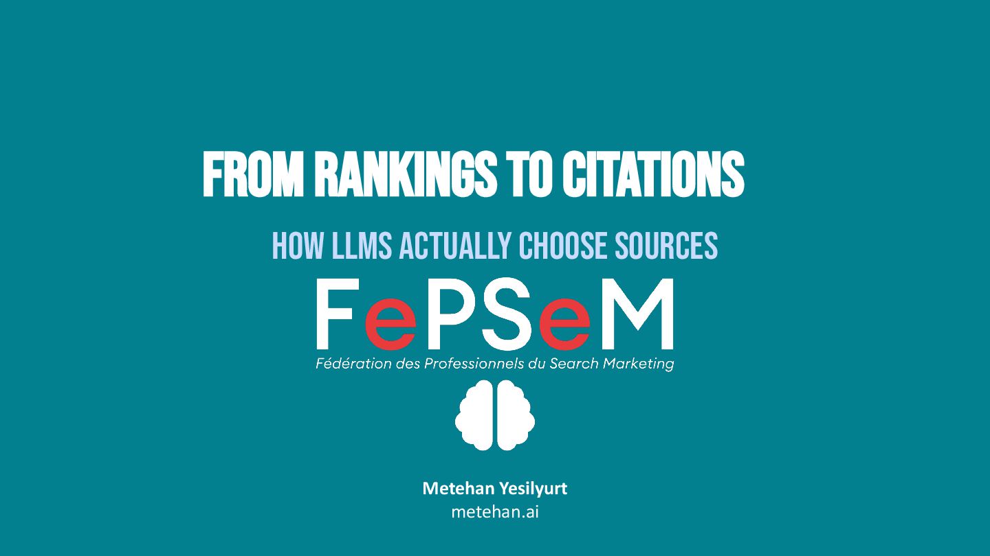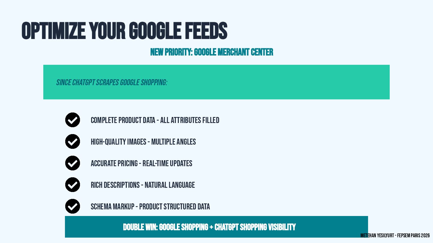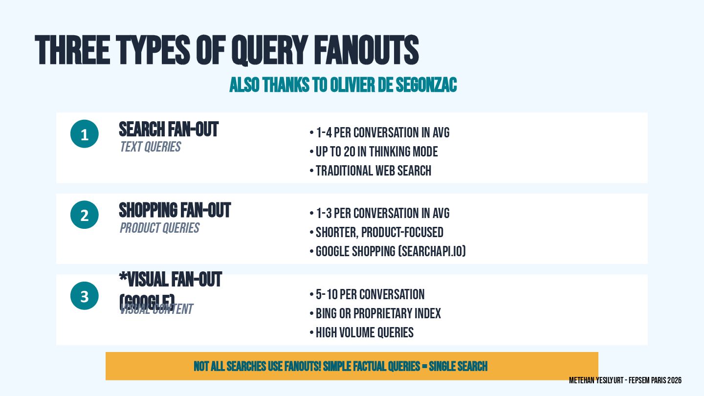 LLMS HAVE RECENCY BIAS, UPDATE YOUR POSTS/PAGES OLDER THAN 6 months chatgpt ıs usıng longer fanouts, run base prompts multıple tımes CHECK FOR LLM CONSISTENCY SIMILAR/SAME PROMPTS ON GOOGLE AI MODE, PERPLEXITY, MISTRAL SAVE FANOUTS, RUN ANALYSIS, IDENTIFY TOPIC GAPS Metehan Yesilyurt - FePSeM Paris 2026 CHECK REDDIT CITATIONS, LOOK FOR USERS QUESTIONS, IDENTIFY GAPS NICHE DOWN AS POSSIBLE, CREATE PROMPTS FOR DIFFERENT BUYER PERSONAS, THEY LIKELY PROMPTING; “I’m thinking of, fınd me, search for me x,y,z”