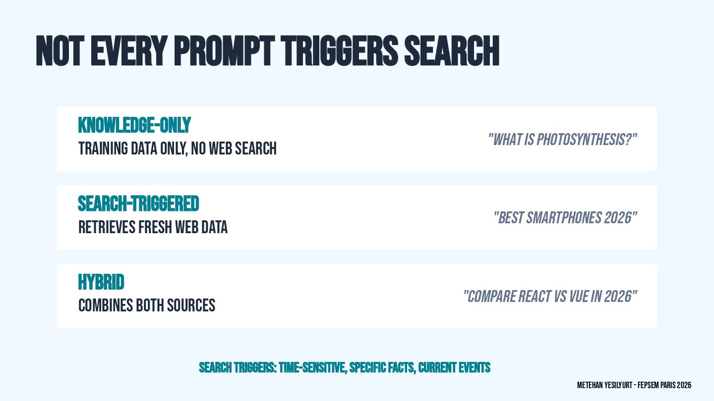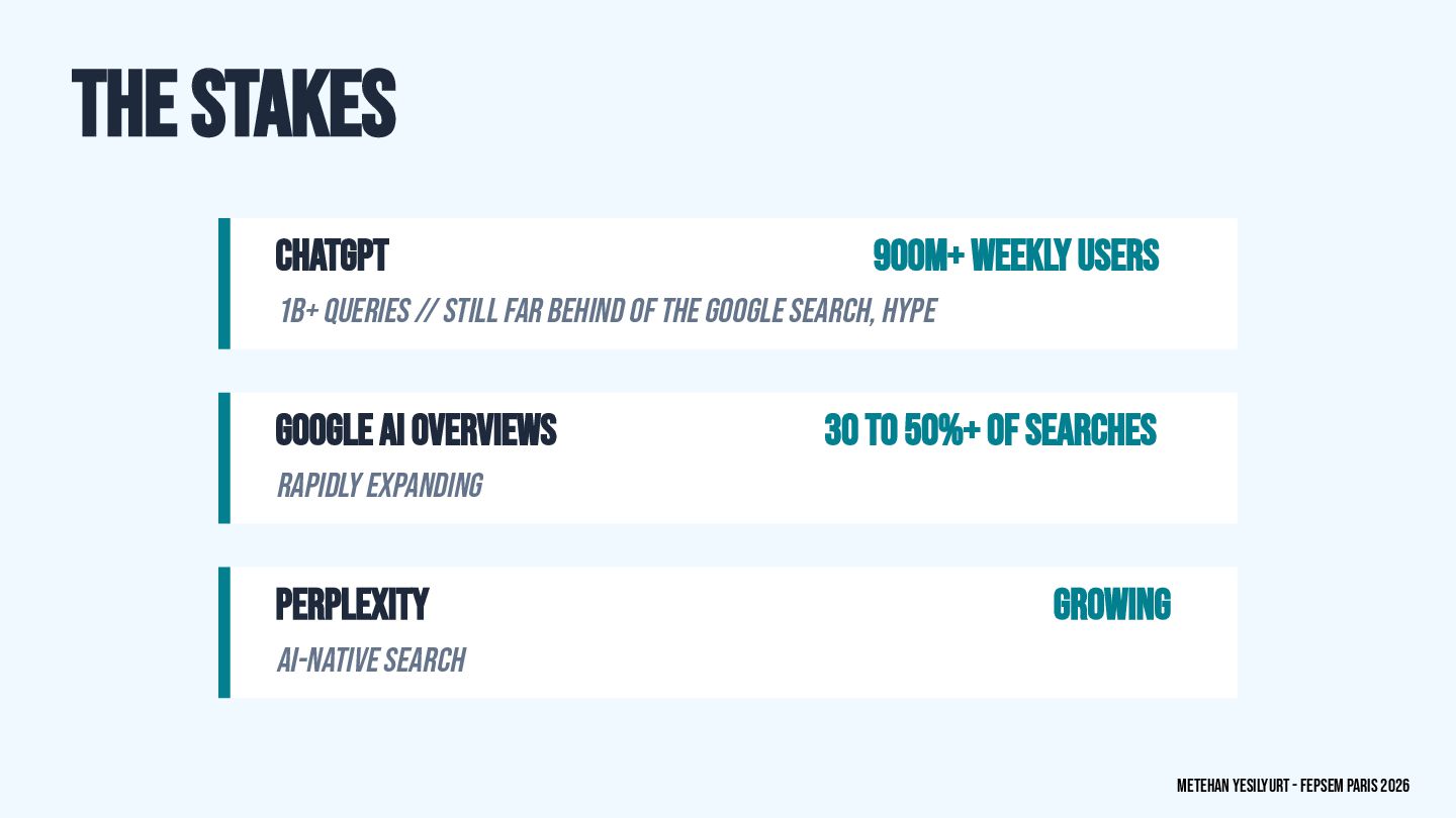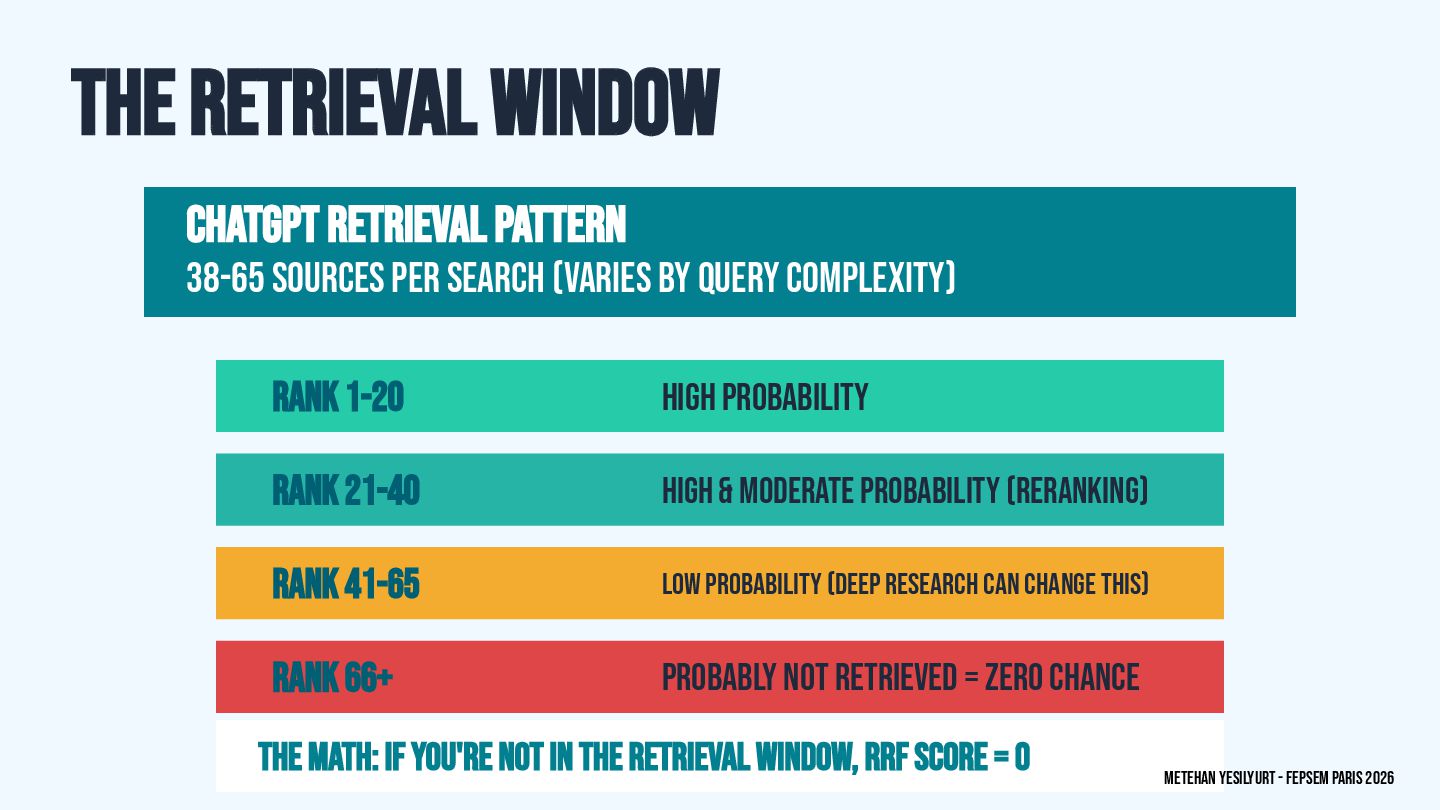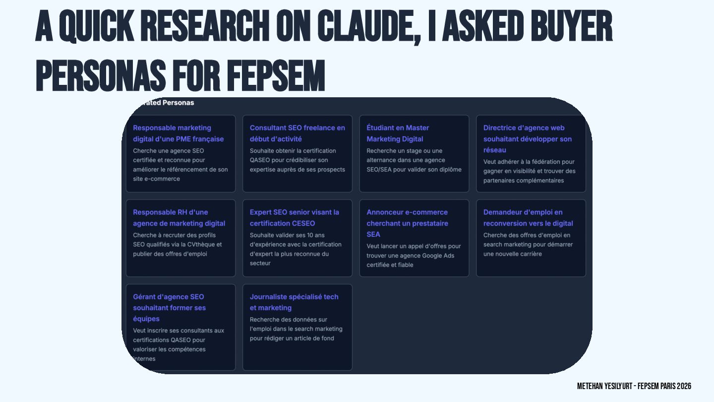 LLMS HAVE RECENCY BIAS, UPDATE YOUR POSTS/PAGES OLDER THAN 6 months chatgpt ıs usıng longer fanouts, run base prompts multıple tımes CHECK FOR LLM CONSISTENCY SIMILAR/SAME PROMPTS ON GOOGLE AI MODE, PERPLEXITY, MISTRAL SAVE FANOUTS, RUN ANALYSIS, IDENTIFY TOPIC GAPS Metehan Yesilyurt - FePSeM Paris 2026 CHECK REDDIT CITATIONS, LOOK FOR USERS QUESTIONS, IDENTIFY GAPS NICHE DOWN AS POSSIBLE, CREATE PROMPTS FOR DIFFERENT BUYER PERSONAS, THEY LIKELY PROMPTING; “I’m thinking of, fınd me, search for me x,y,z”
