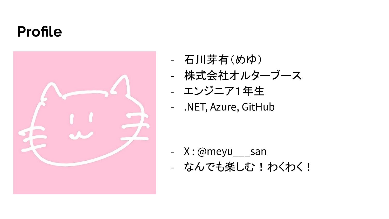 Profile - 石川芽有(めゆ) - 株式会社オルターブース - エンジニア1年生 - .NET, Azure,