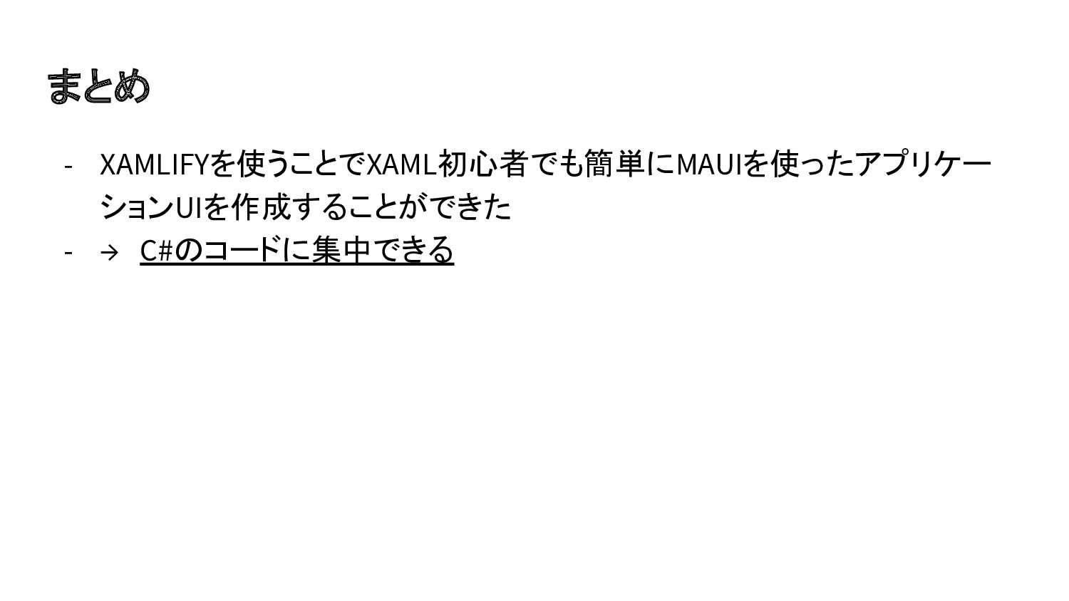 まとめ - XAMLIFYを使うことでXAML初心者でも簡単にMAUIを使ったアプリケー ションUIを作成することができた - → C#のコードに集中できる