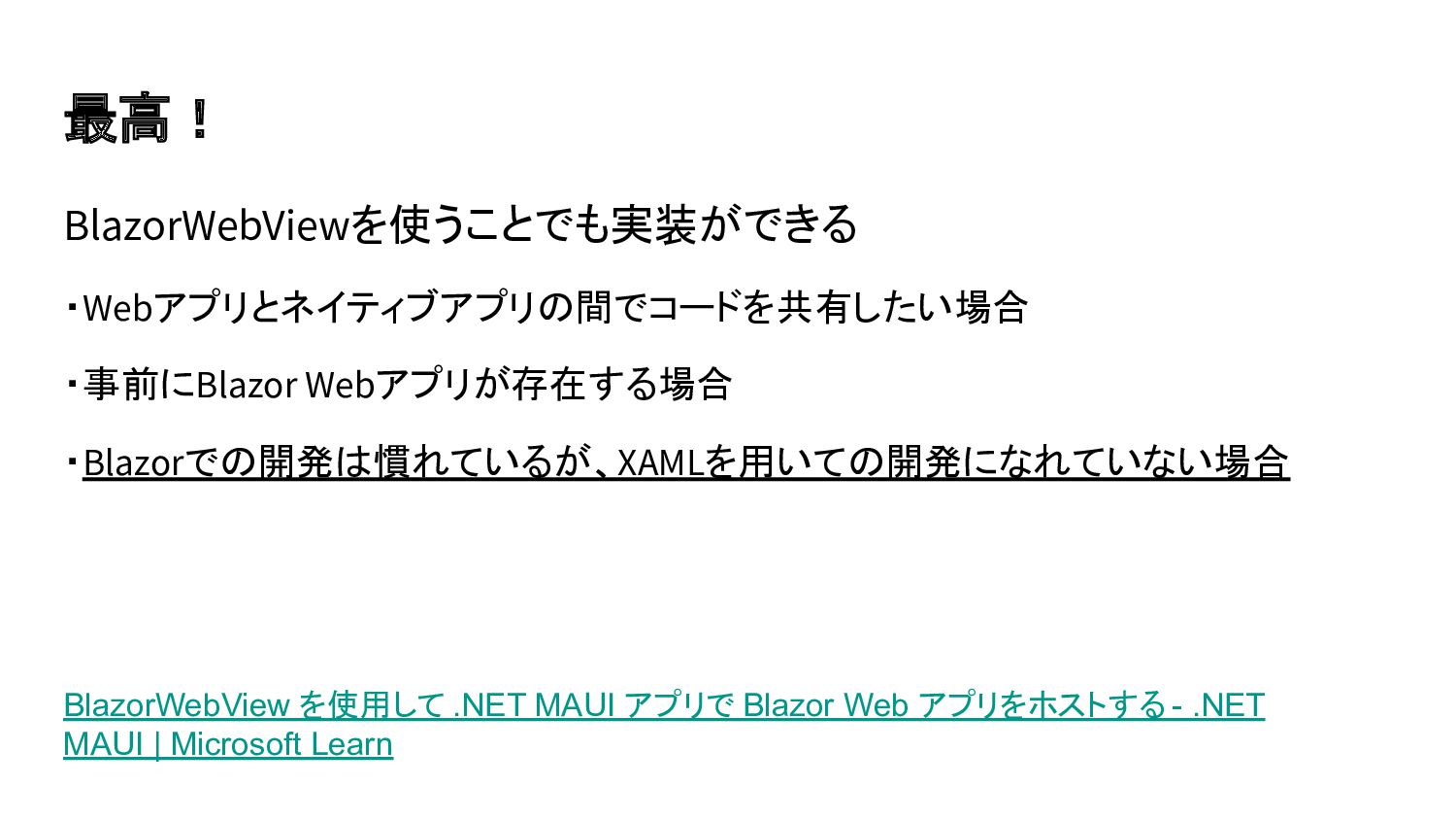 最高! BlazorWebViewを使うことでも実装ができる ・Webアプリとネイティブアプリの間でコードを共有したい場合 ・事前にBlazor Webアプリが存在する場合 ・Blazorでの開発は慣れているが、XAMLを用いての開発になれていない場合 BlazorWebView を使用して .NET MAUI
