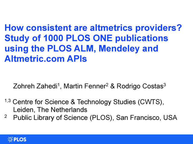 publications using the PLOS ALM, Mendeley and Altmetric.com APIs ! ! Zohreh Zahedi1, Martin Fenner2 & Rodrigo Costas3 ! 1,3 Centre for Science & Technology Studies (CWTS), Leiden, The Netherlands 2 Public Library of Science (PLOS), San Francisco, USA