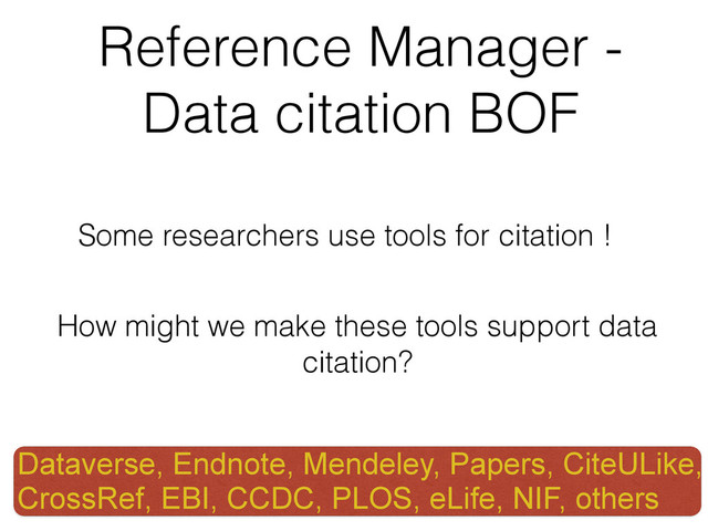 CiteULike, CrossRef, EBI, CCDC, PLOS, eLife, NIF, others Some researchers use tools for citation ! How might we make these tools support data citation?