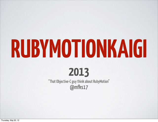 RUBYMOTIONKAIGI 2013 “That Objective-C guy think about RubyMotion” @mfks17 Thursday,