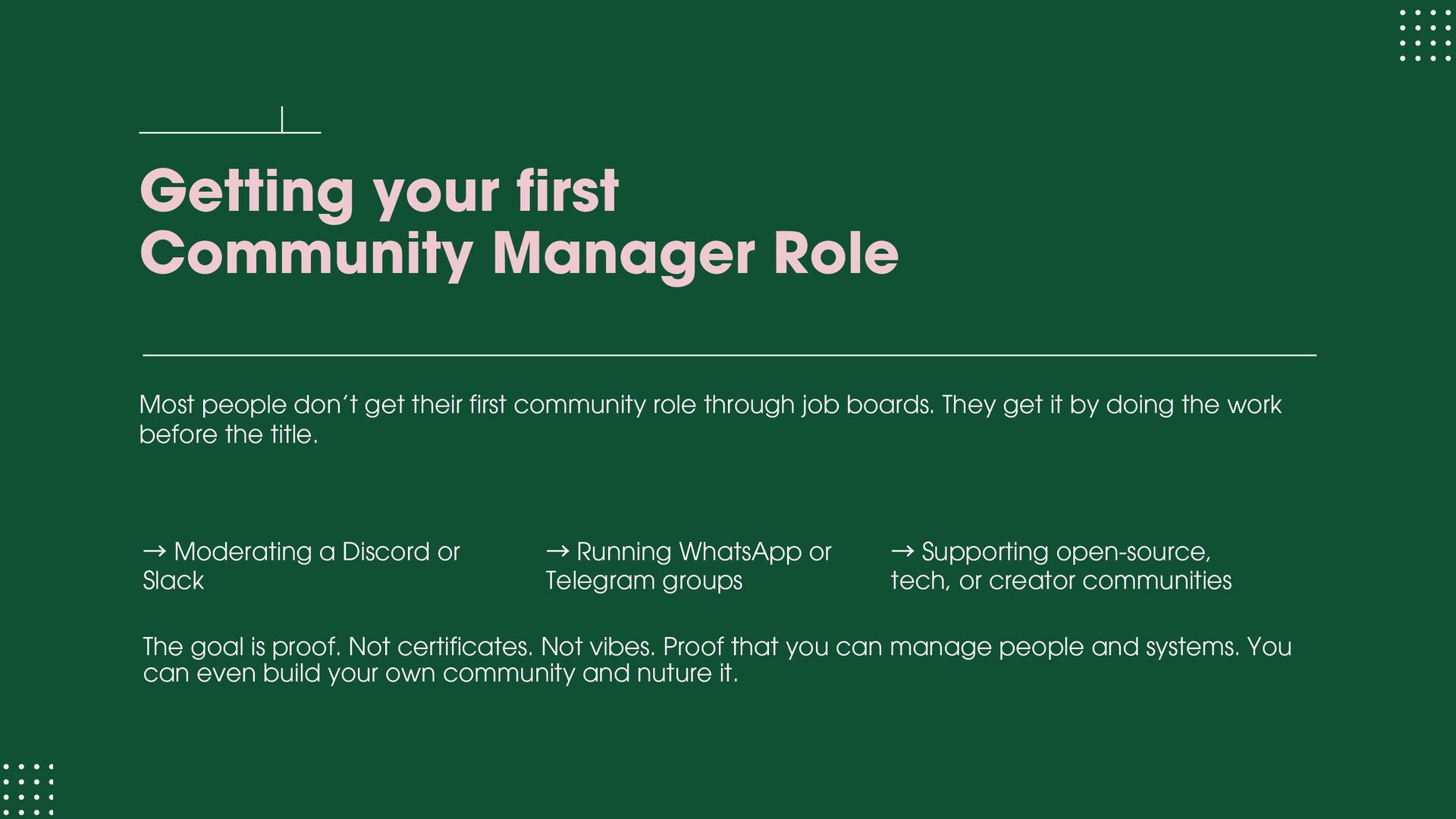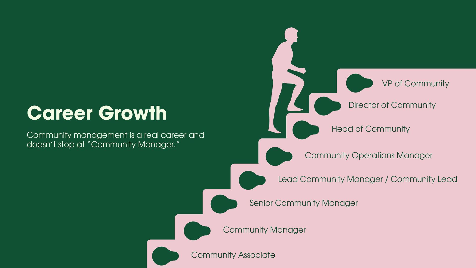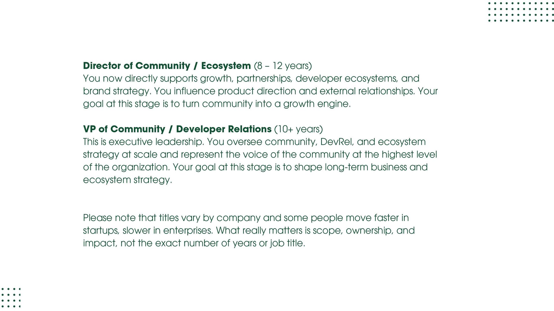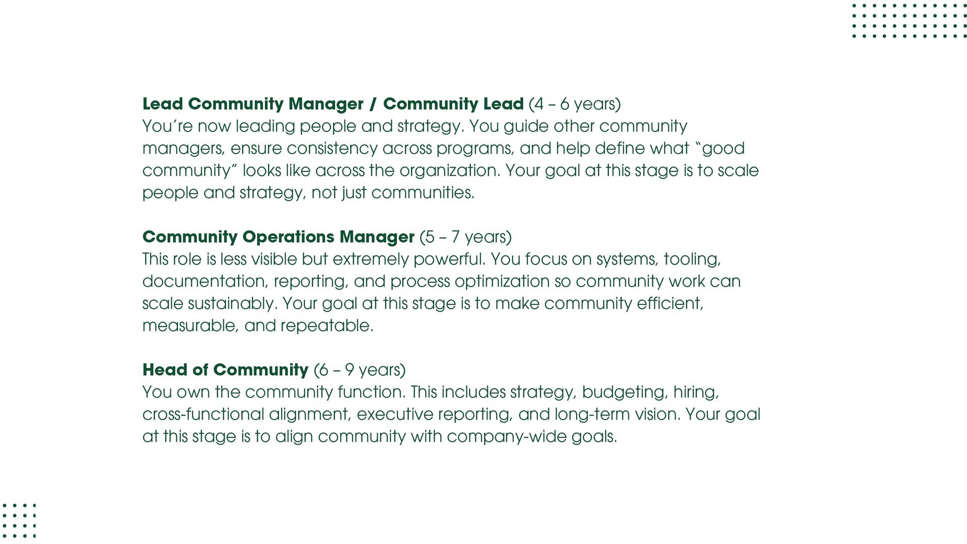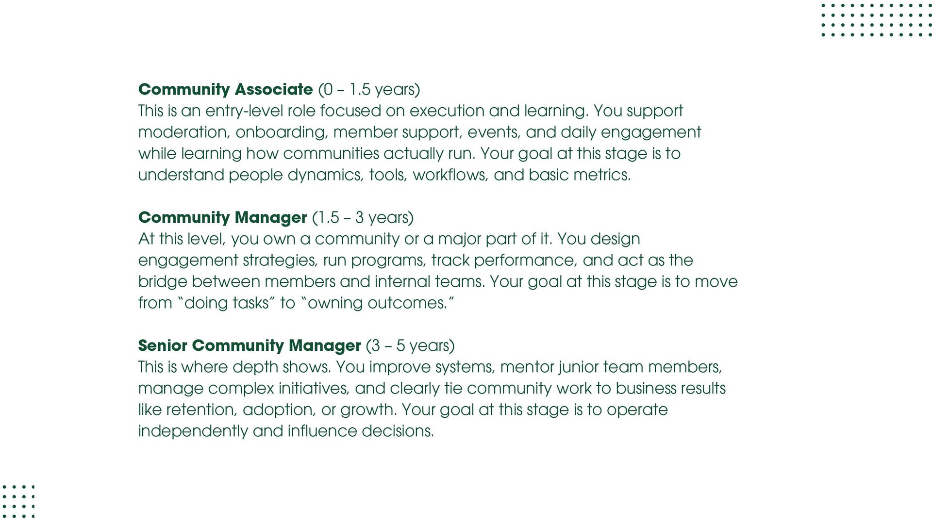 role focused on execution and learning. You support moderation, onboarding, member support, events, and daily engagement while learning how communities actually run. Your goal at this stage is to understand people dynamics, tools, workflows, and basic metrics. Community Manager (1.5 – 3 years) At this level, you own a community or a major part of it. You design engagement strategies, run programs, track performance, and act as the bridge between members and internal teams. Your goal at this stage is to move from “doing tasks” to “owning outcomes.” Senior Community Manager (3 – 5 years) This is where depth shows. You improve systems, mentor junior team members, manage complex initiatives, and clearly tie community work to business results like retention, adoption, or growth. Your goal at this stage is to operate independently and influence decisions.