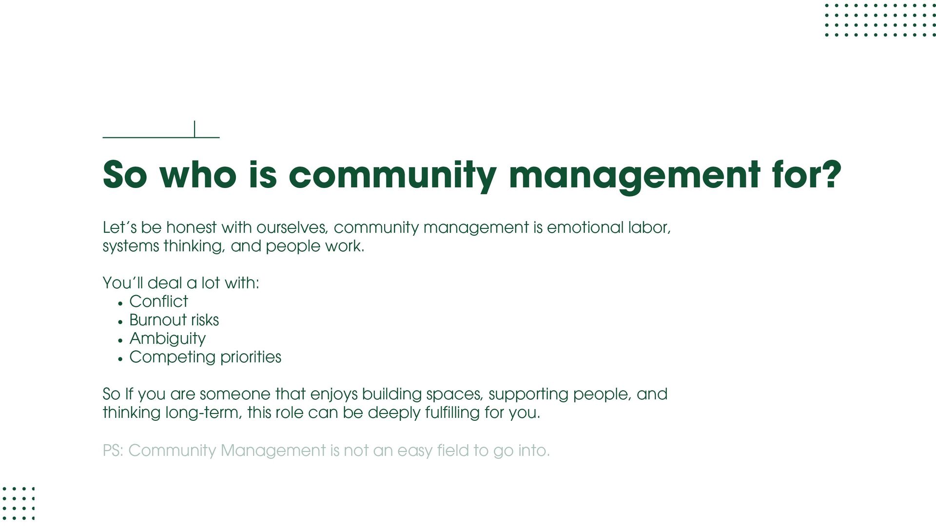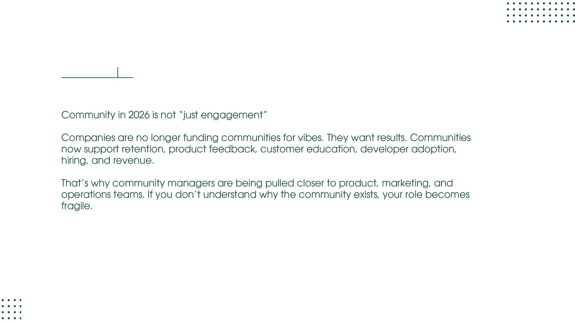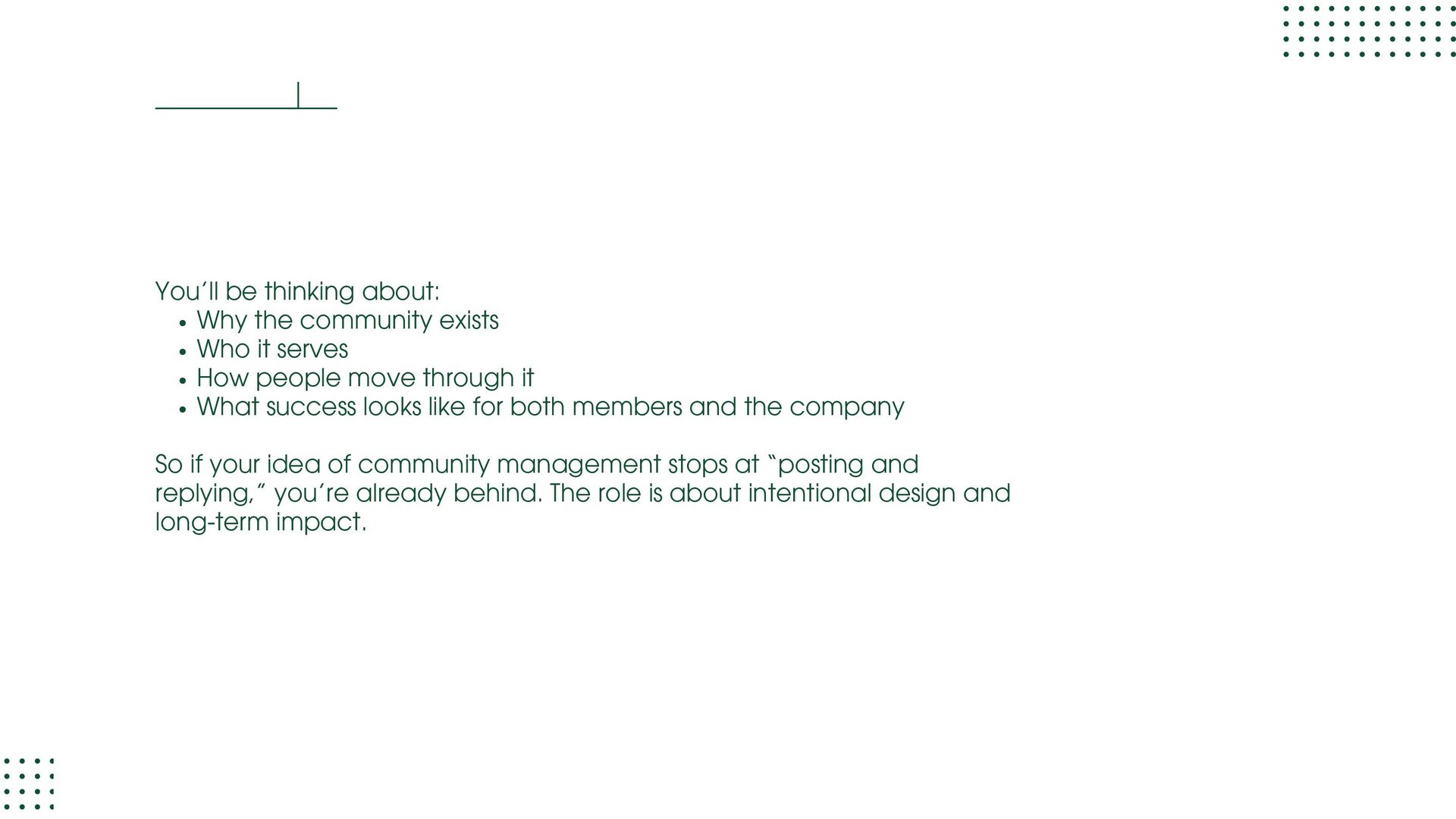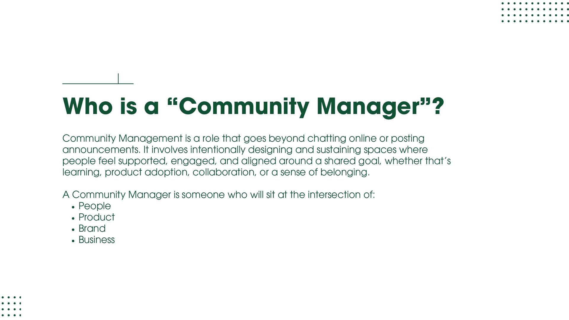 role focused on execution and learning. You support moderation, onboarding, member support, events, and daily engagement while learning how communities actually run. Your goal at this stage is to understand people dynamics, tools, workflows, and basic metrics. Community Manager (1.5 – 3 years) At this level, you own a community or a major part of it. You design engagement strategies, run programs, track performance, and act as the bridge between members and internal teams. Your goal at this stage is to move from “doing tasks” to “owning outcomes.” Senior Community Manager (3 – 5 years) This is where depth shows. You improve systems, mentor junior team members, manage complex initiatives, and clearly tie community work to business results like retention, adoption, or growth. Your goal at this stage is to operate independently and influence decisions.