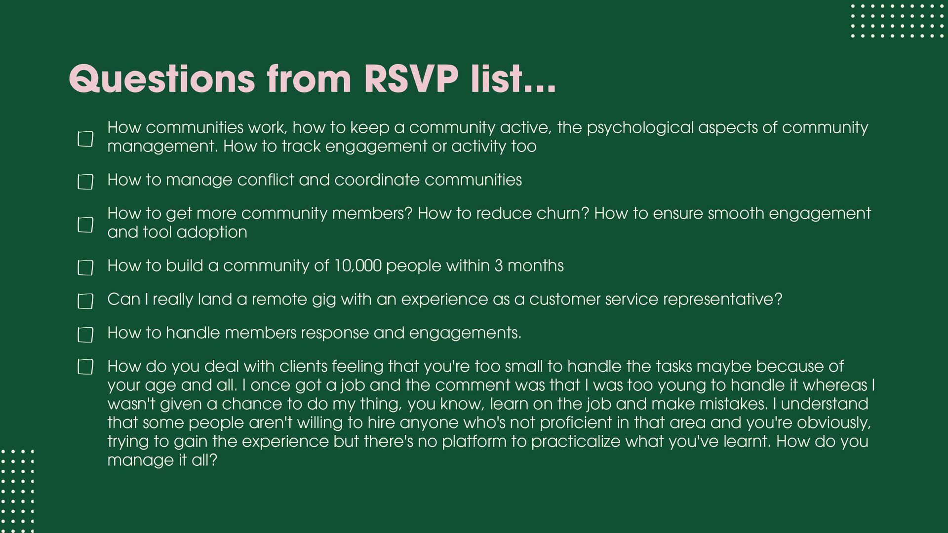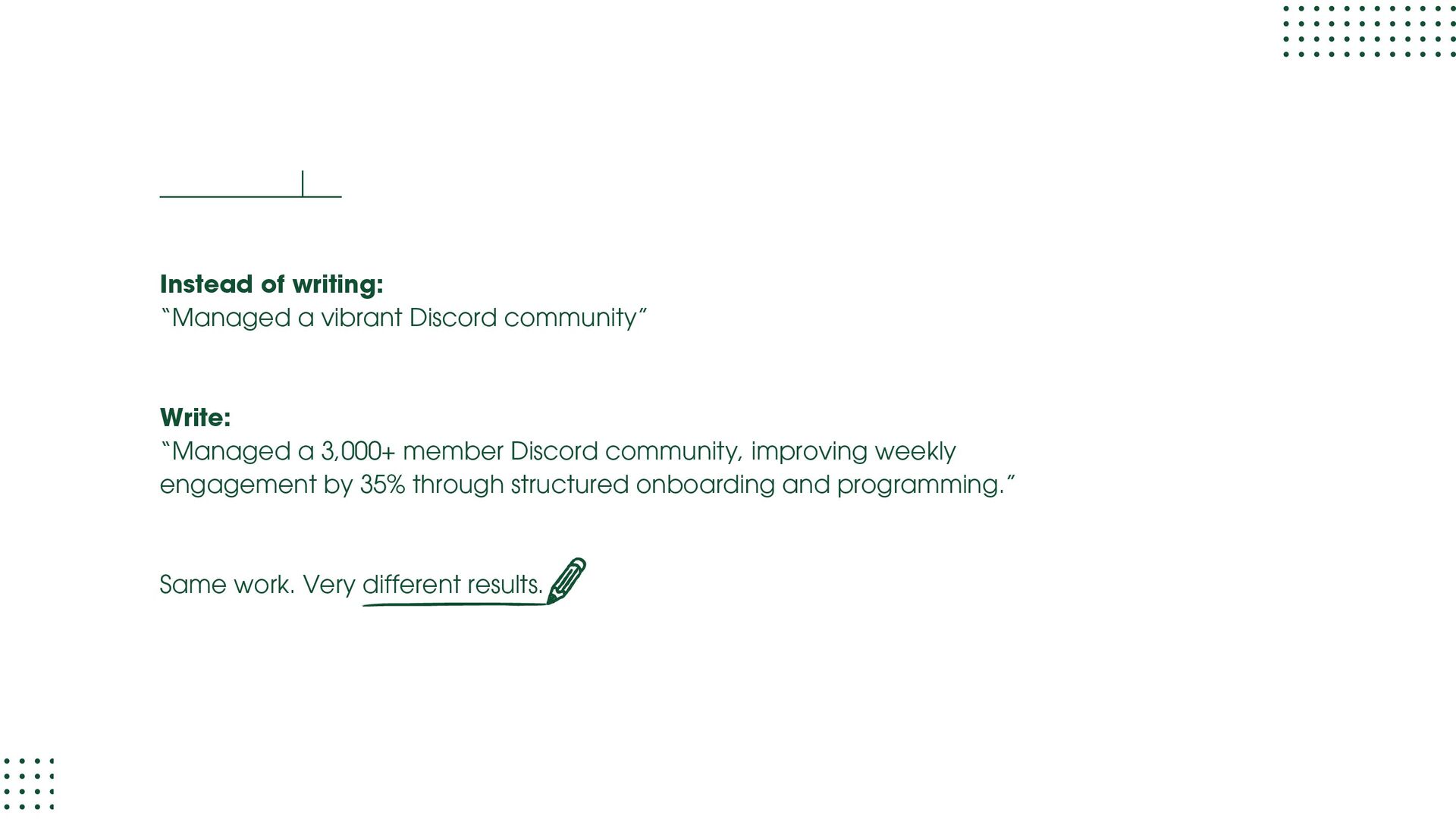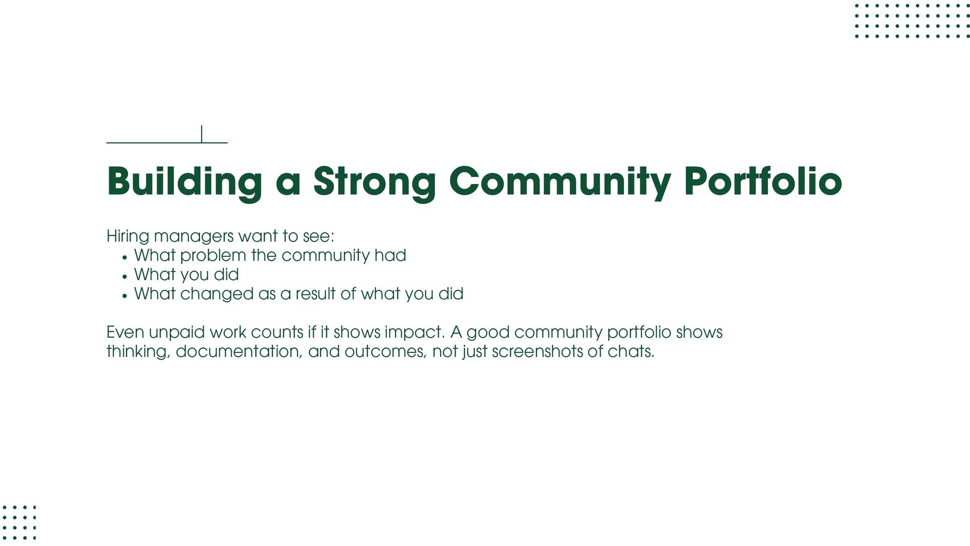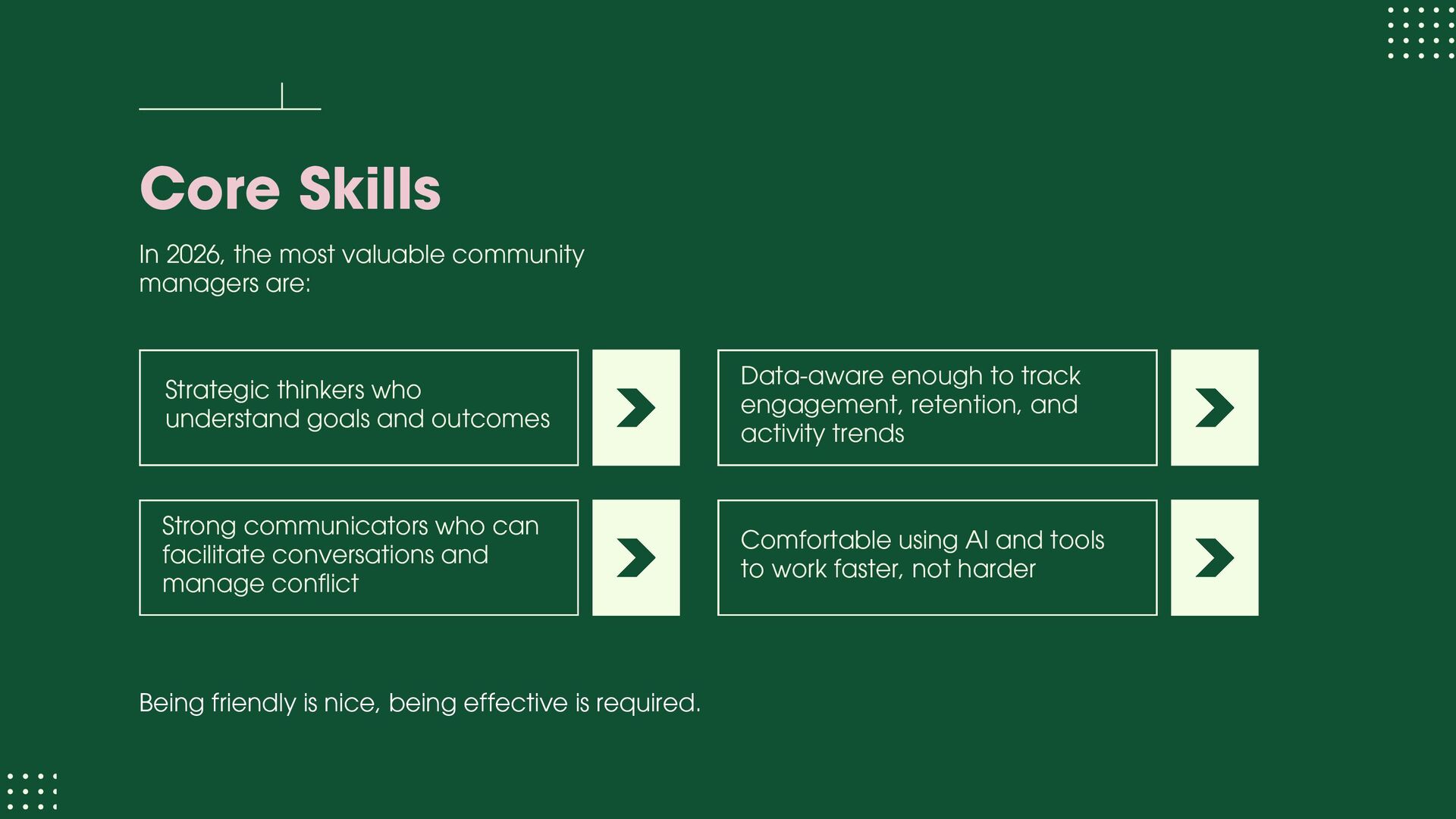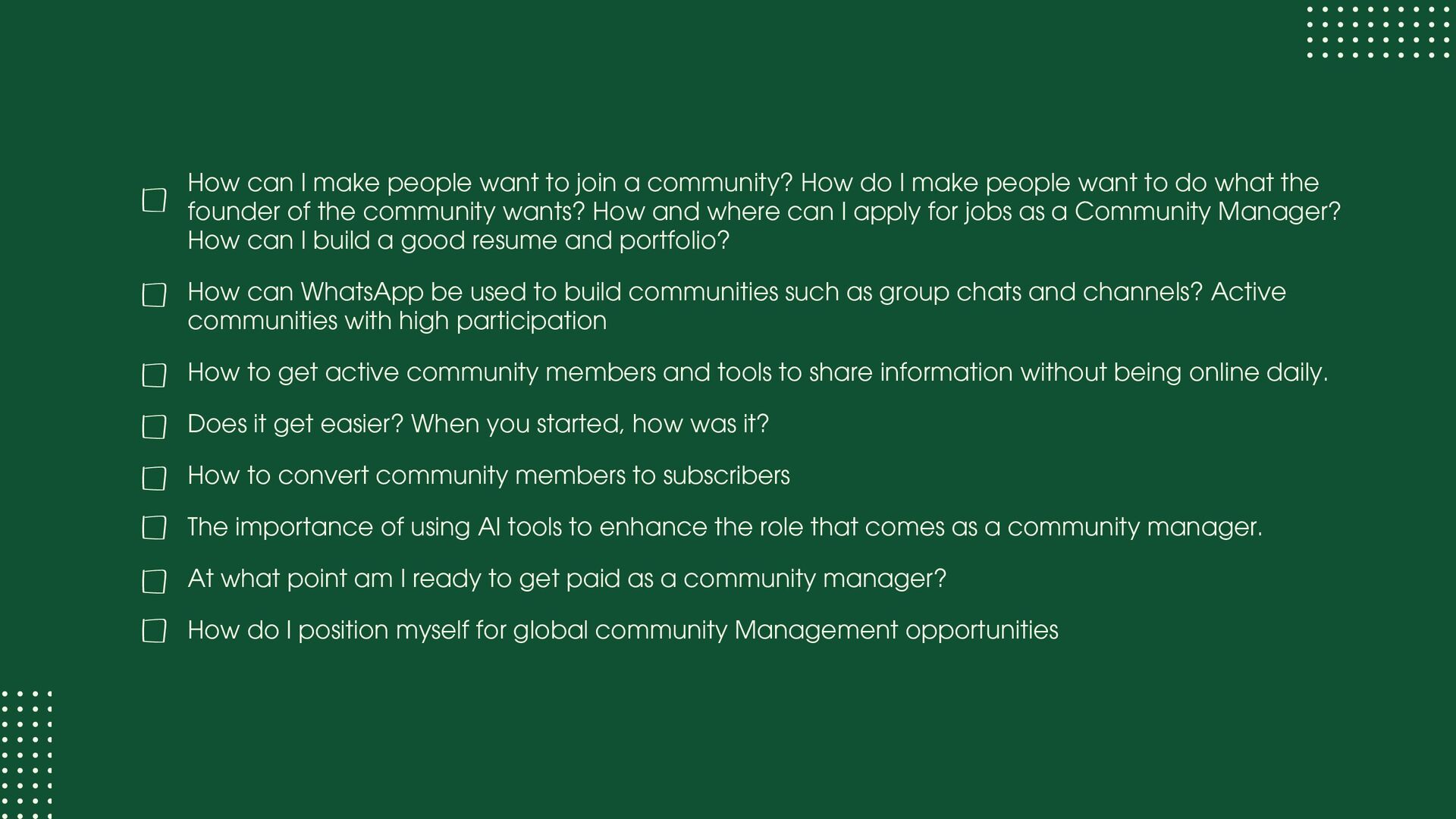 role focused on execution and learning. You support moderation, onboarding, member support, events, and daily engagement while learning how communities actually run. Your goal at this stage is to understand people dynamics, tools, workflows, and basic metrics. Community Manager (1.5 – 3 years) At this level, you own a community or a major part of it. You design engagement strategies, run programs, track performance, and act as the bridge between members and internal teams. Your goal at this stage is to move from “doing tasks” to “owning outcomes.” Senior Community Manager (3 – 5 years) This is where depth shows. You improve systems, mentor junior team members, manage complex initiatives, and clearly tie community work to business results like retention, adoption, or growth. Your goal at this stage is to operate independently and influence decisions.