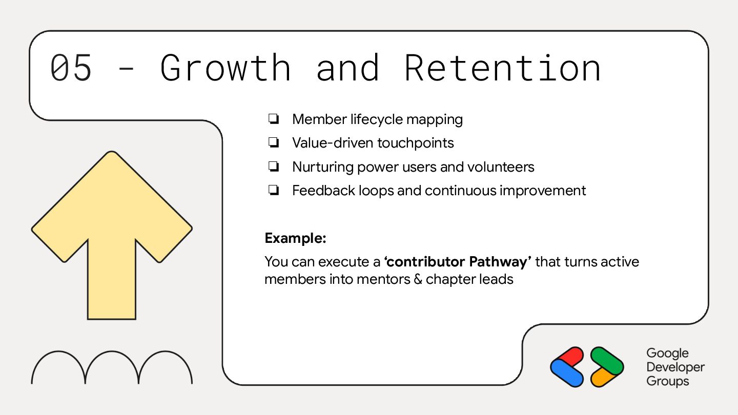 Value-driven touchpoints ❏ Nurturing power users and volunteers ❏ Feedback loops and continuous improvement Example: You can execute a ‘contributor Pathway’ that turns active members into mentors & chapter leads