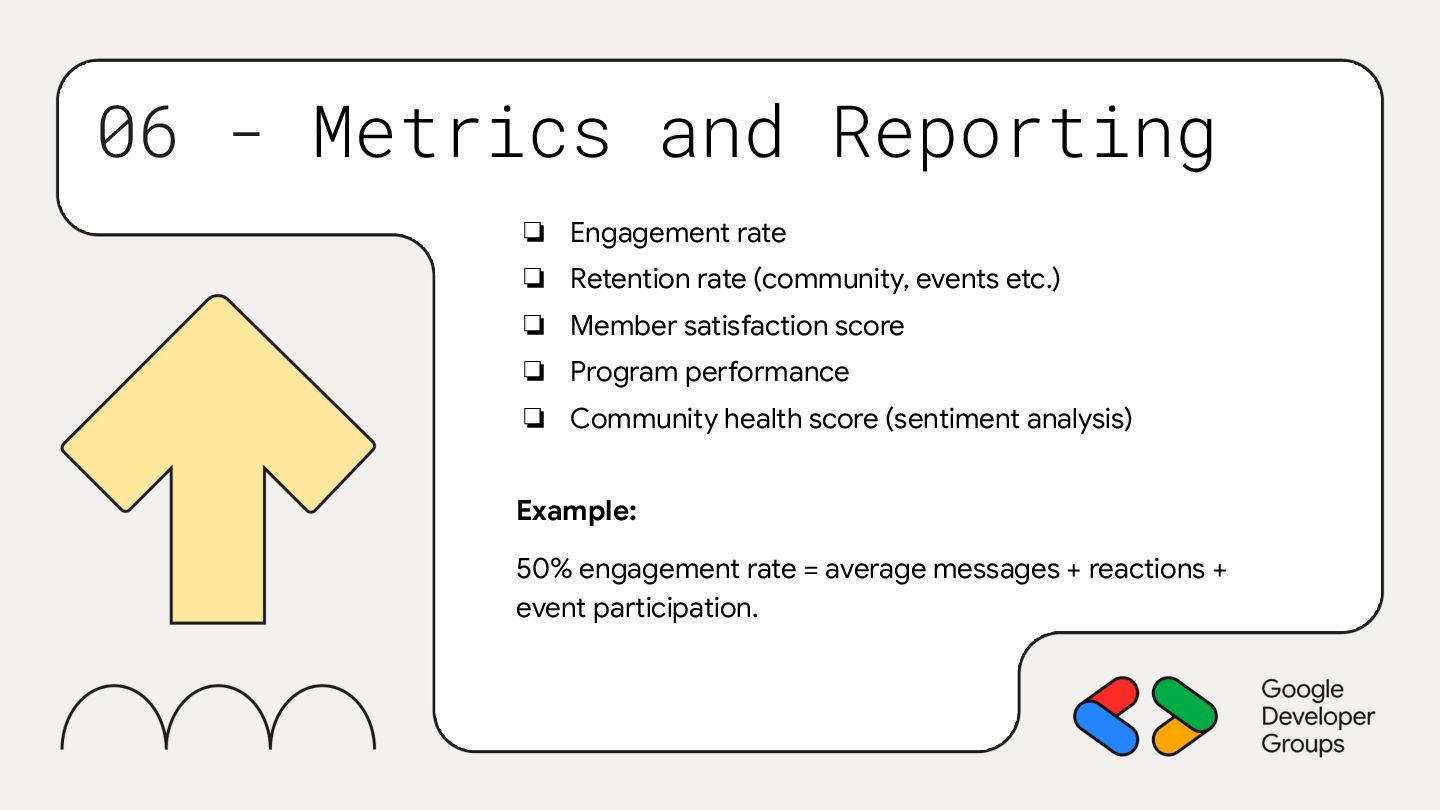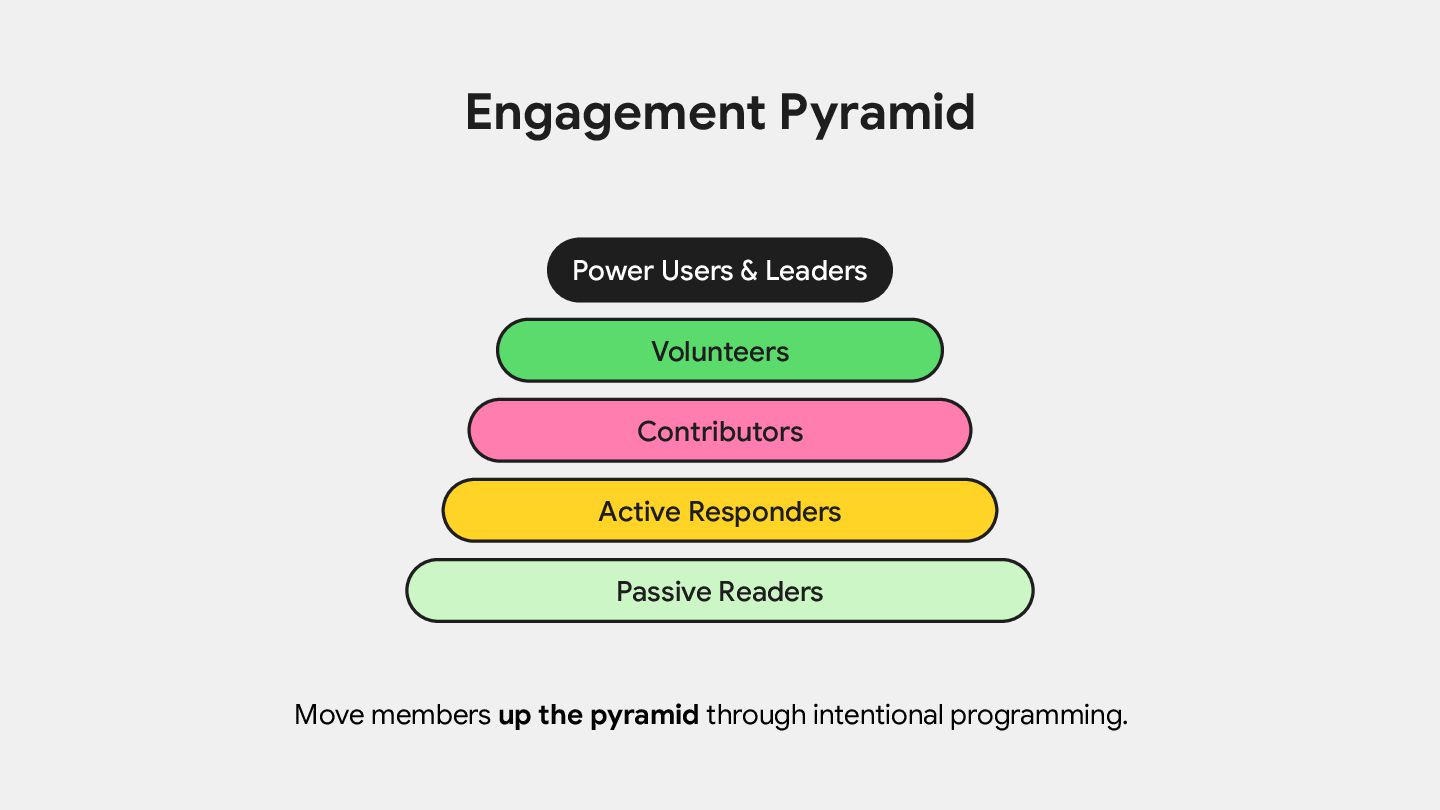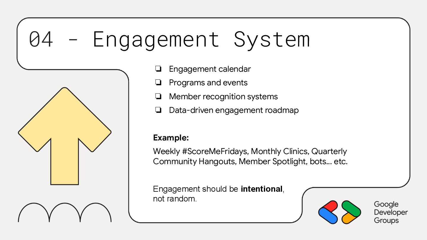 events ❏ Member recognition systems ❏ Data-driven engagement roadmap Example: Weekly #ScoreMeFridays, Monthly Clinics, Quarterly Community Hangouts, Member Spotlight, bots… etc. Engagement should be intentional, not random.