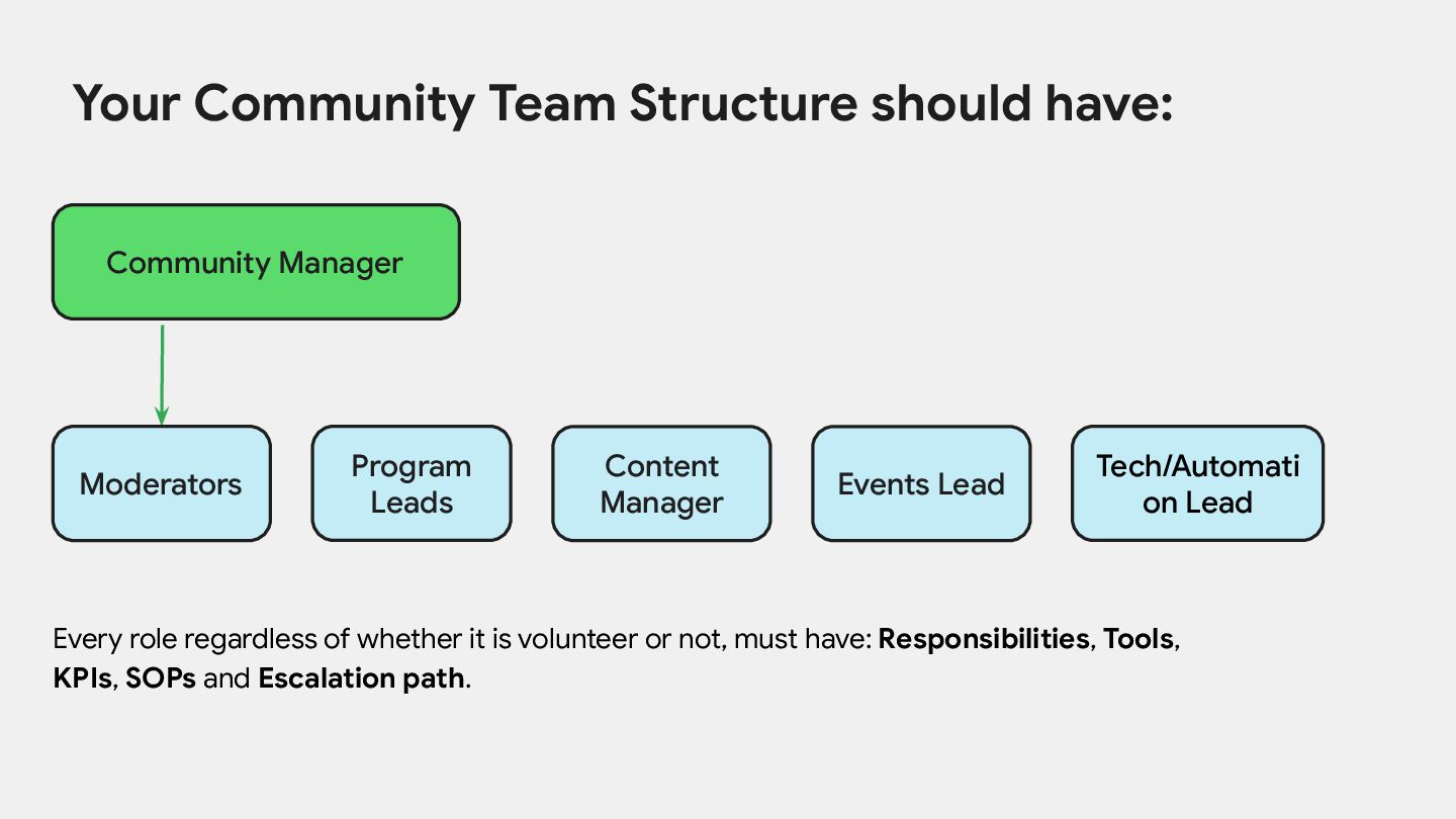 Leads Content Manager Events Lead Tech/Automati on Lead Every role regardless of whether it is volunteer or not, must have: Responsibilities, Tools, KPIs, SOPs and Escalation path.