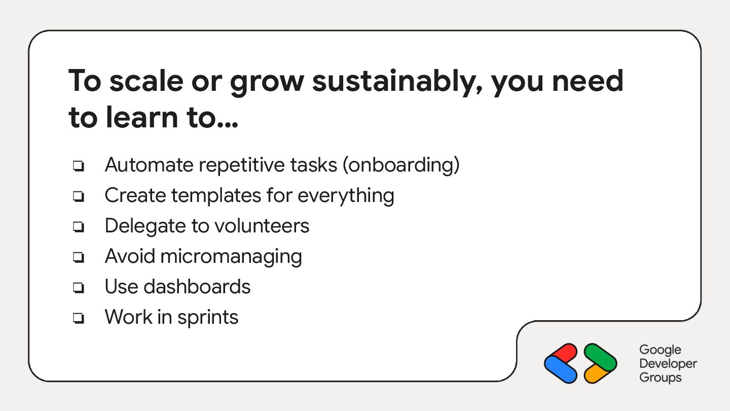 ❏ Automate repetitive tasks (onboarding) ❏ Create templates for everything ❏ Delegate to volunteers ❏ Avoid micromanaging ❏ Use dashboards ❏ Work in sprints