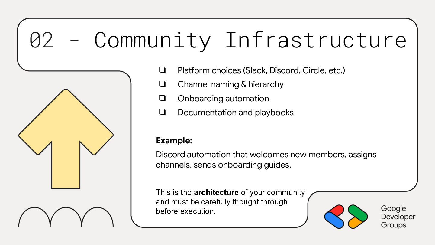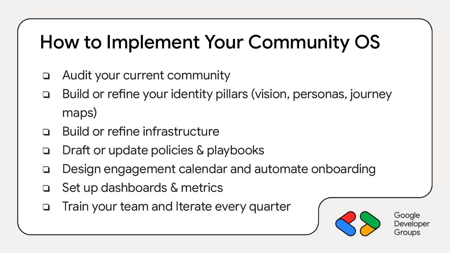 community ❏ Build or refine your identity pillars (vision, personas, journey maps) ❏ Build or refine infrastructure ❏ Draft or update policies & playbooks ❏ Design engagement calendar and automate onboarding ❏ Set up dashboards & metrics ❏ Train your team and Iterate every quarter